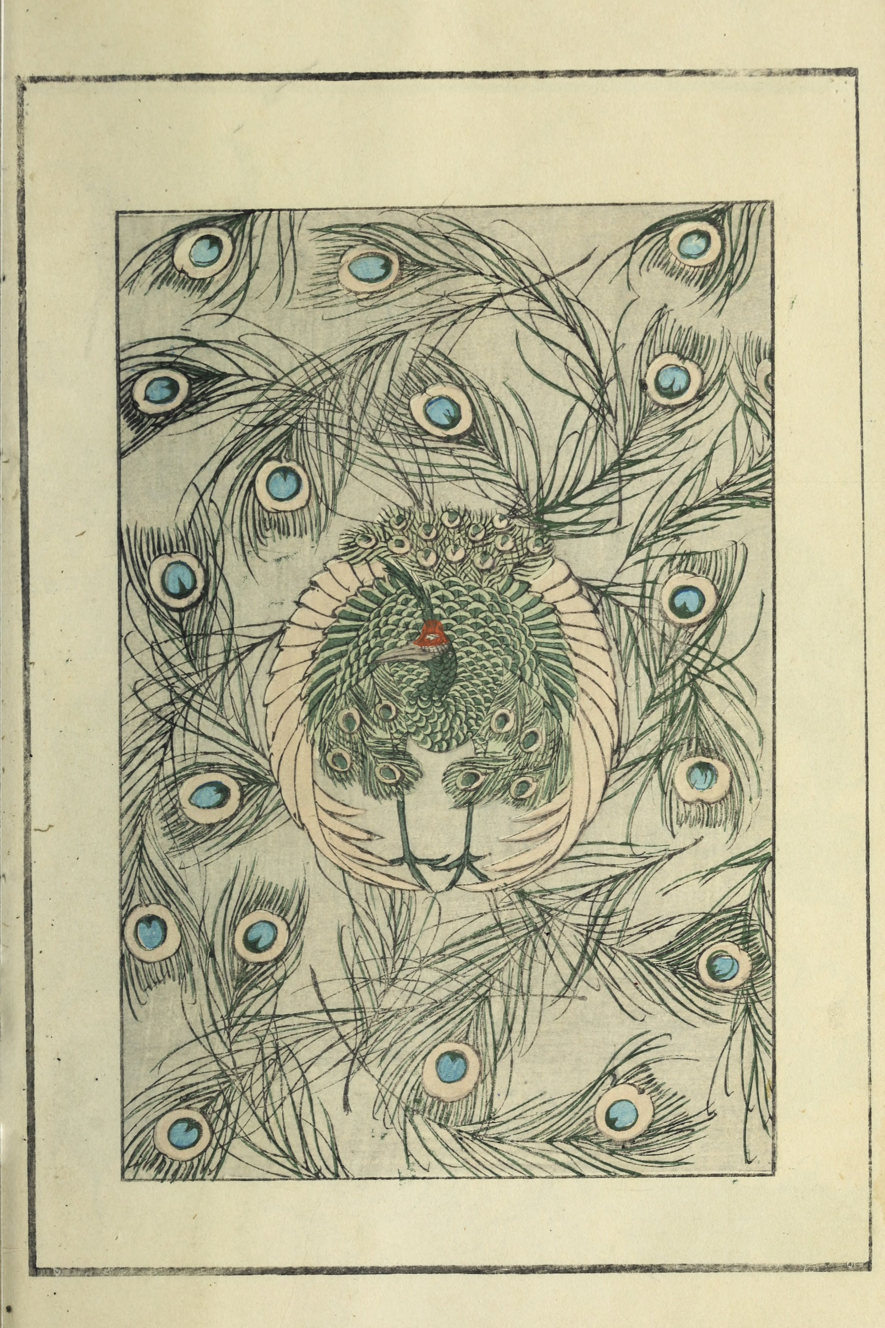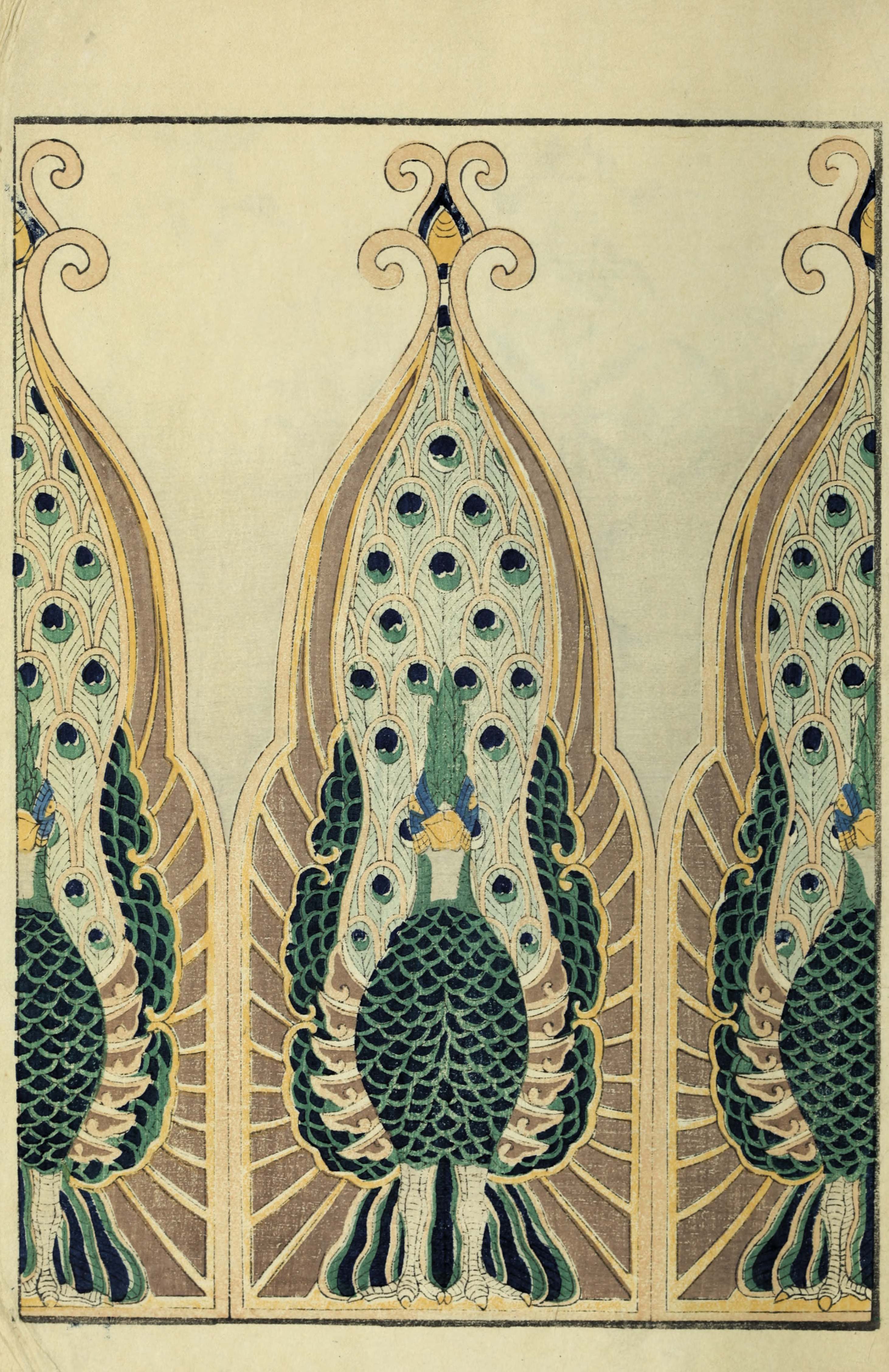Japanese textile pattern featuring three stylised peacocks in an Art Nouveau arch arrangement, with tail feathers in teal green and dark blue.