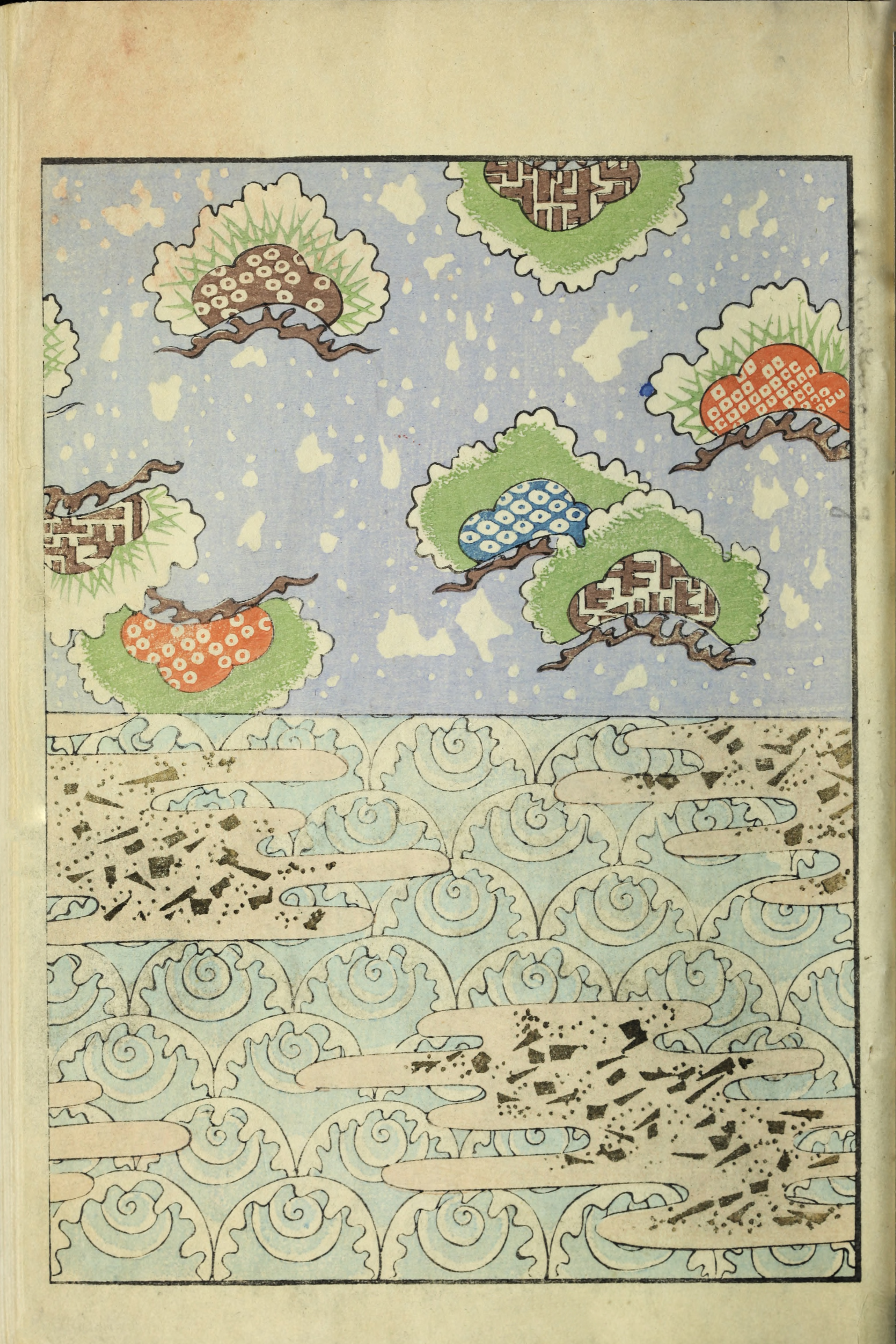 Stylized pine trees in colourful canopies above, and ocean waves in a spiral scroll pattern below.