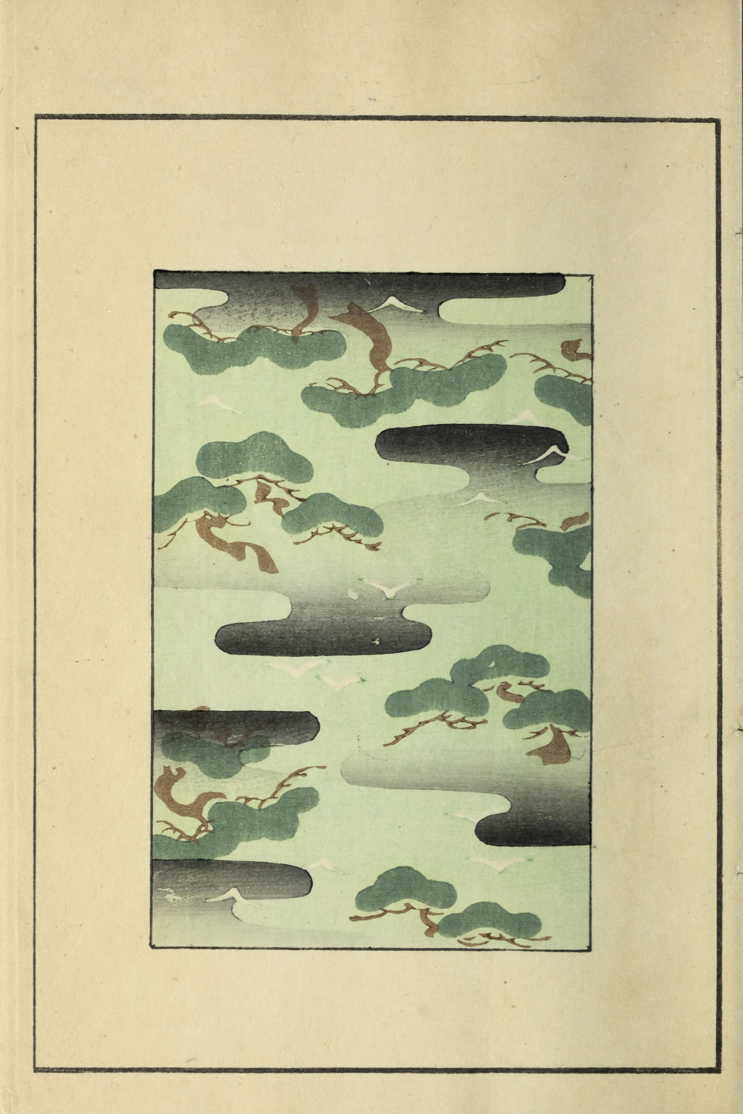 Japanese textile pattern with gnarled pine trees and dark cloud bands with small white birds on a pale green background.