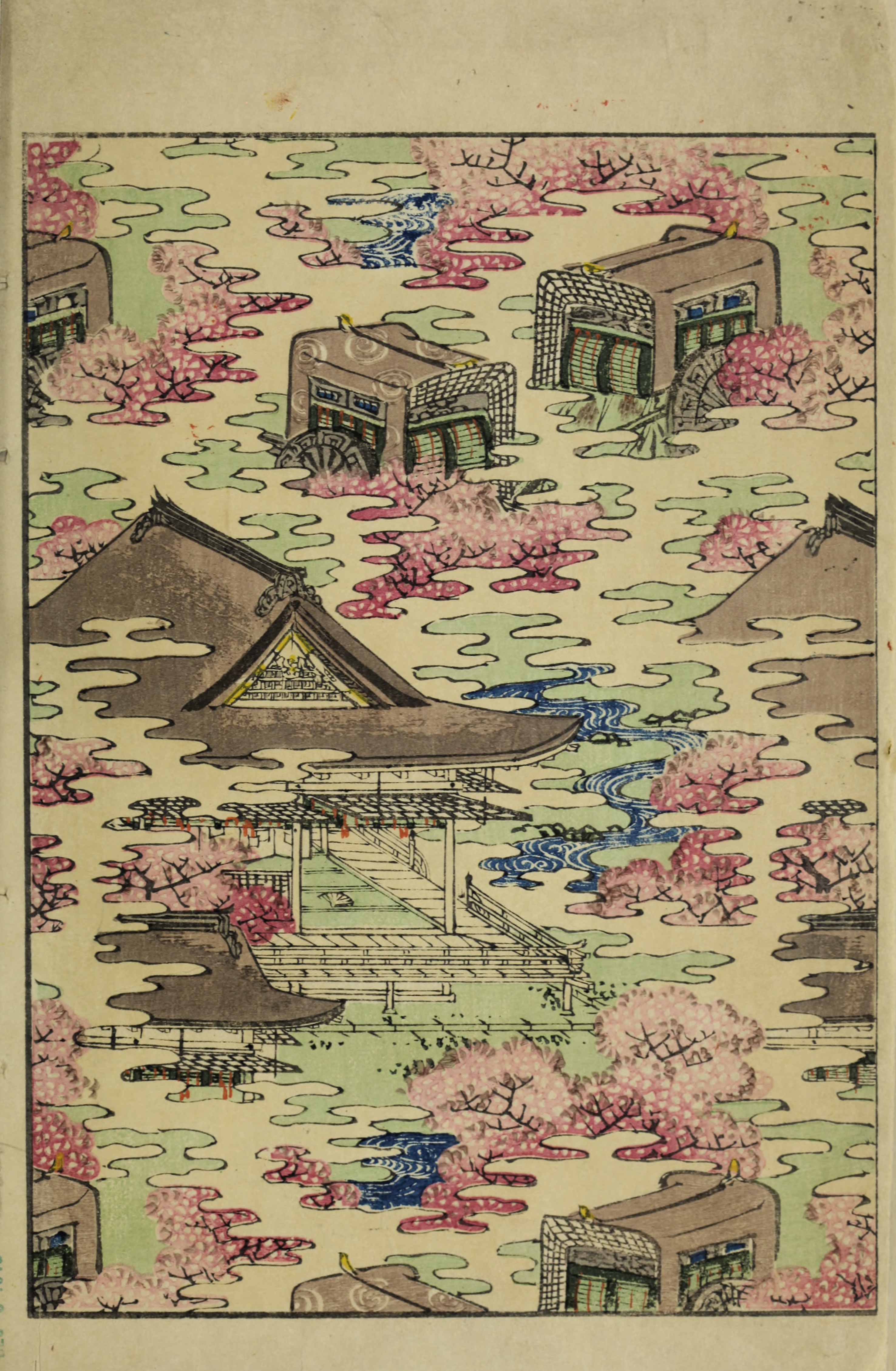 Temple architecture and ox-drawn carriages among pink cherry blossoms, blue streams, stylised clouds.
