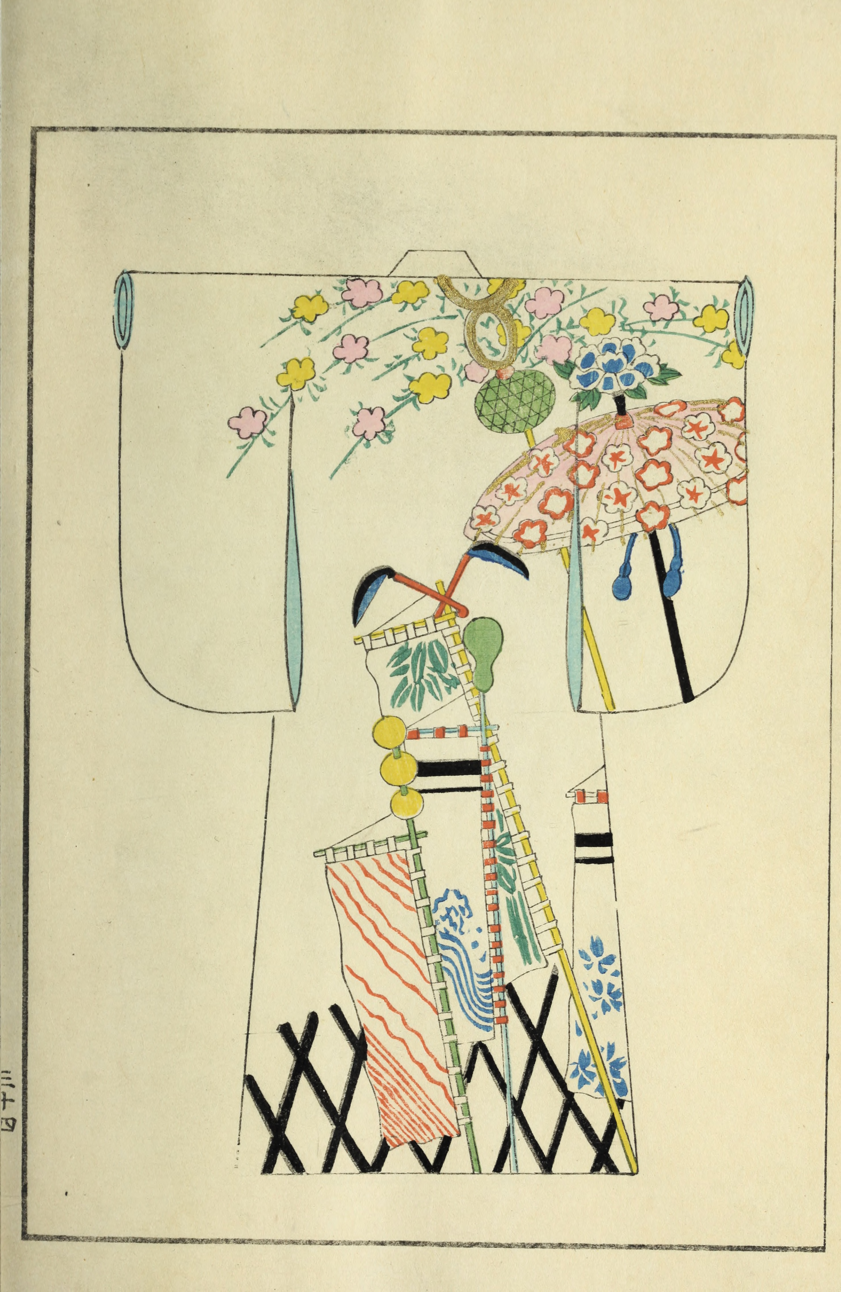 Kimono design with pink and yellow flowers, parasol, festival banners, and black lattice in soft pastels.