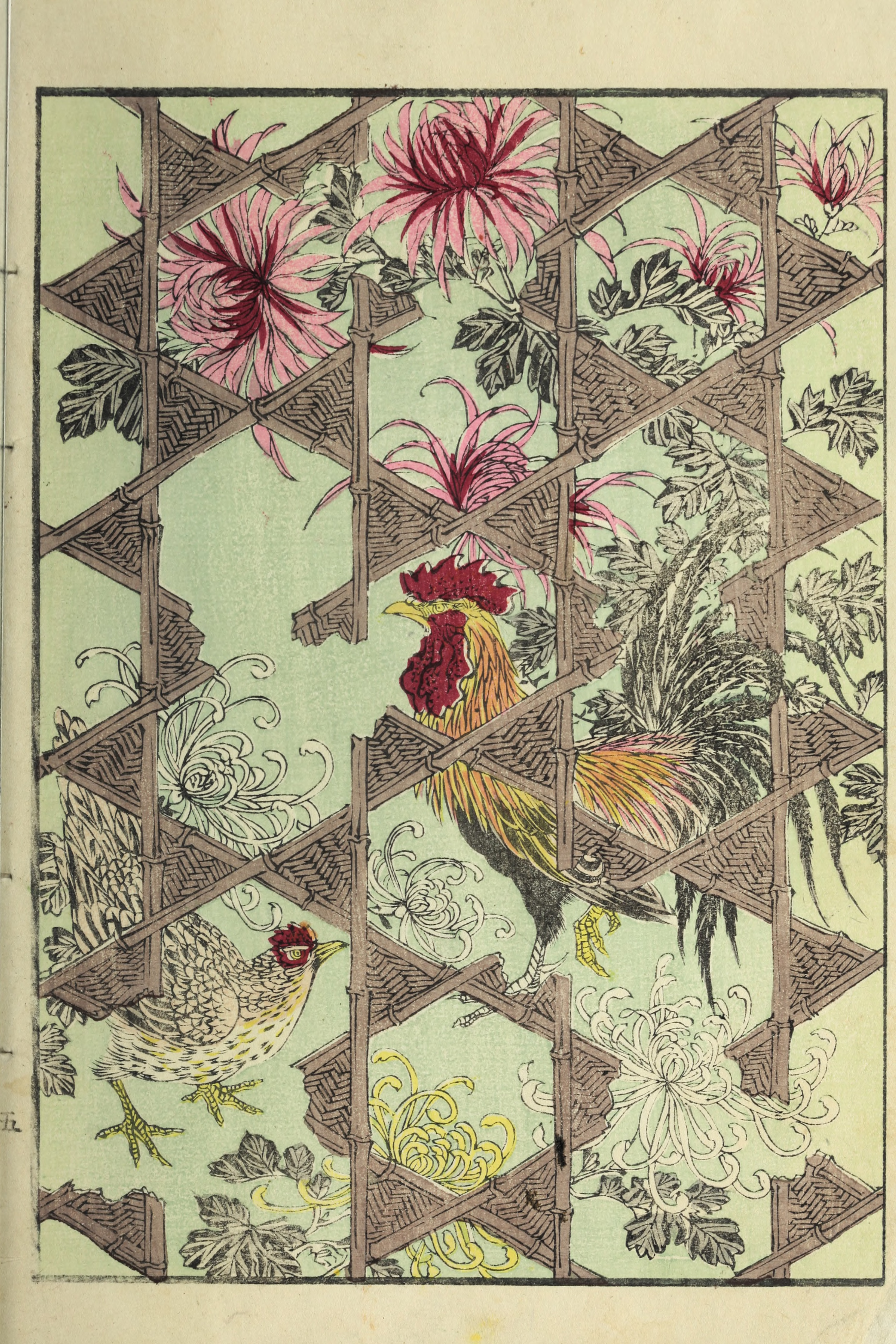 Rooster and hen through a bamboo lattice trellis with pink and white chrysanthemums. Roosters are seen as symbols of alertness and protection. They’re the ones that greet the dawn, after all, so they’re often linked with new beginnings and keeping bad spirits away. Hens add a softer, more domestic feel, sometimes symbolising nurturing and everyday life. Together, they make a nice contrast.