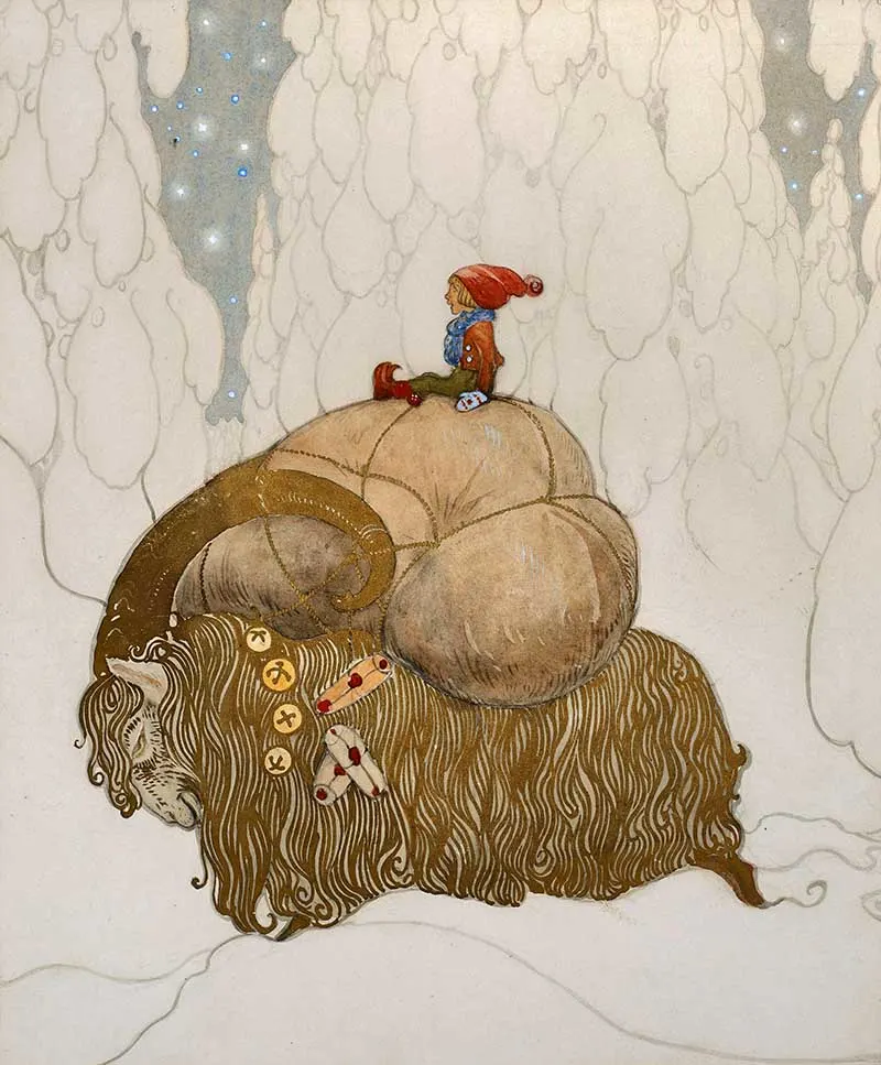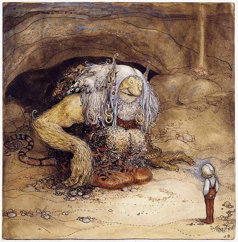 Illustration from the story “The Tale of Day and Day and the Flying Troll on Skyberget” de Harald Östenson, realized by John Bauer for “Among Gnomes and Trolls”
