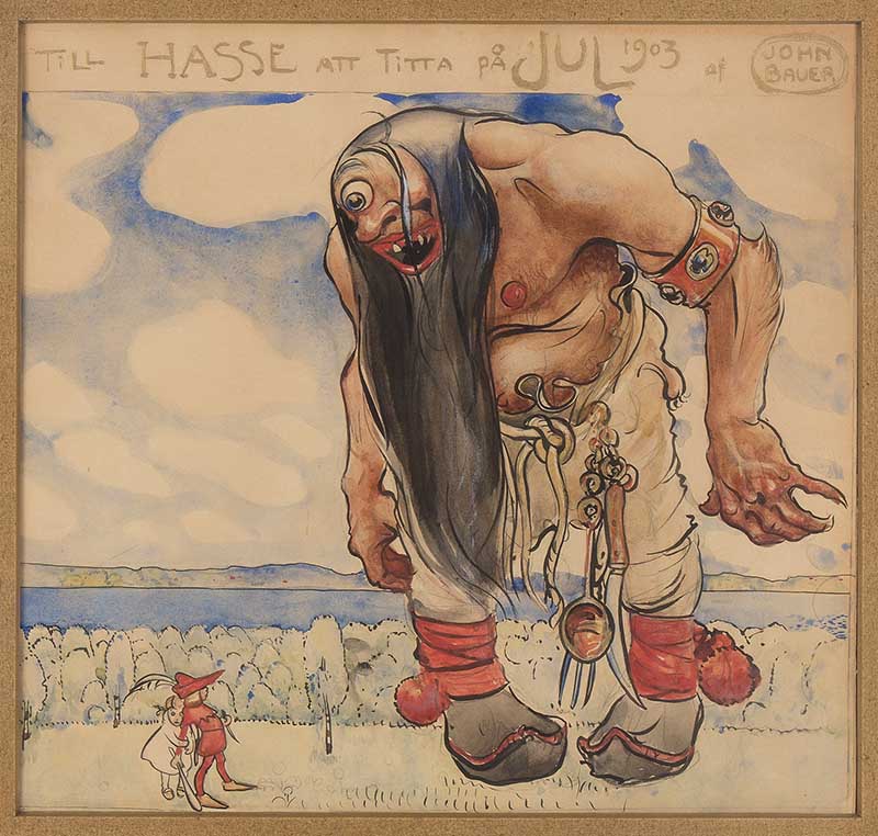 I don’t know much about this particular Bauer drawing except that it is titled “Nilas offer, Julbocken (II)” (Nila’s victim, Christmas goat).
