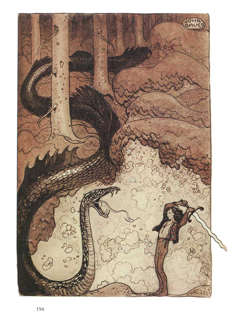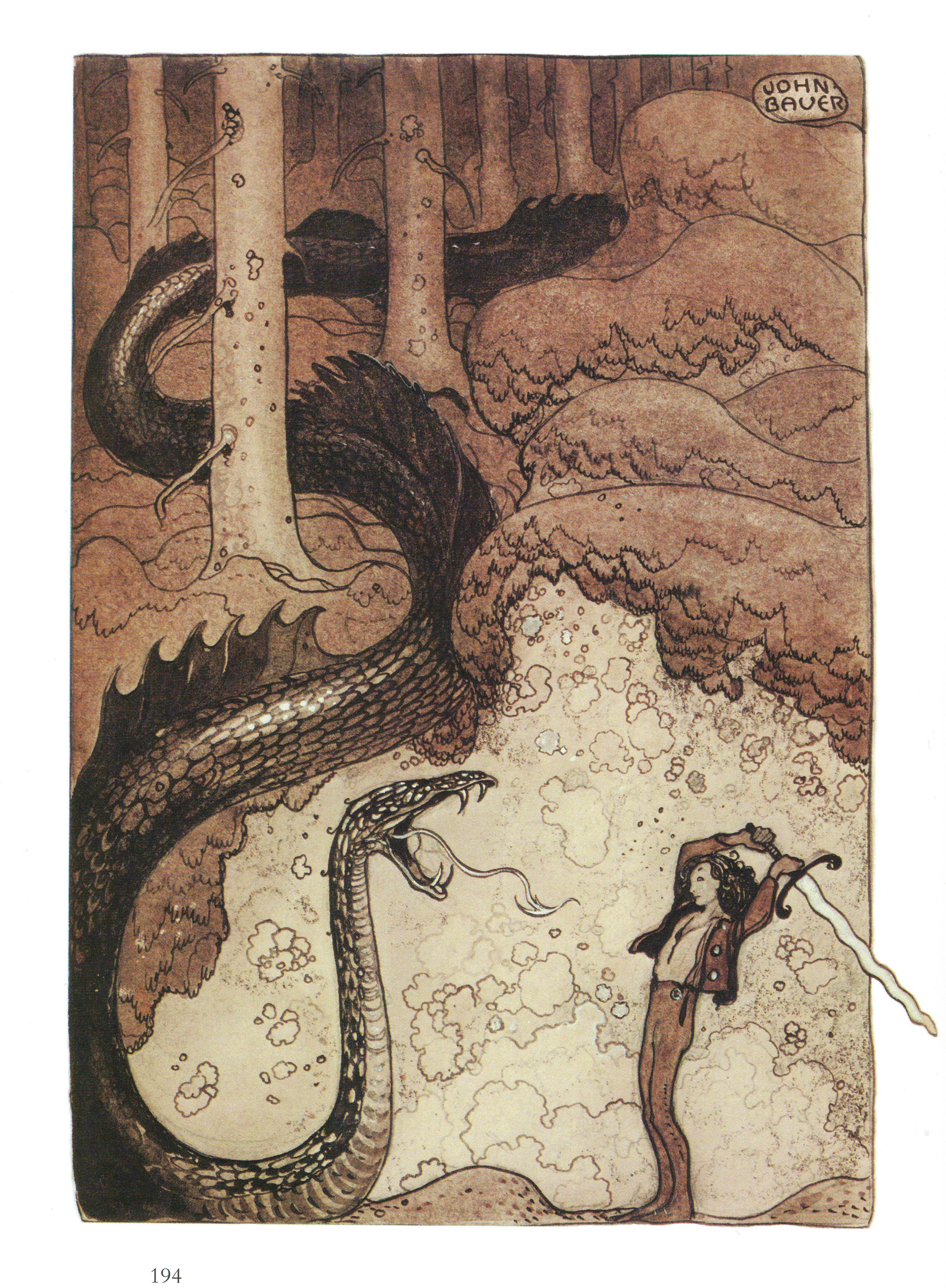 Illustration by John Bauer depicting a young man with a sword fighting a snake. Published in the storybook “Guldslottet, Barnens julbok No. 13” for the story “The Maiden in Rosiga Molnens Borg” by Harald Östenson, 1911.