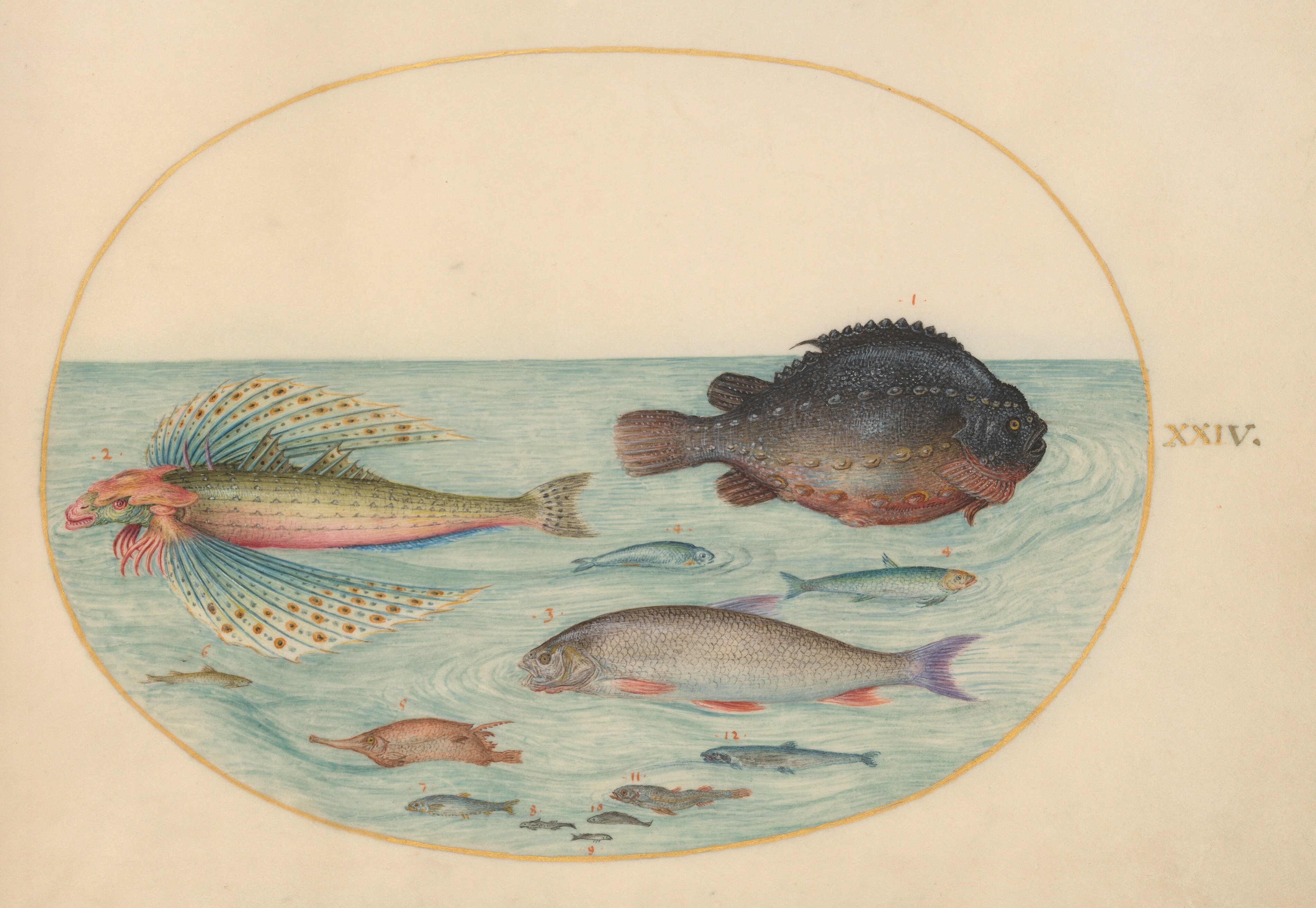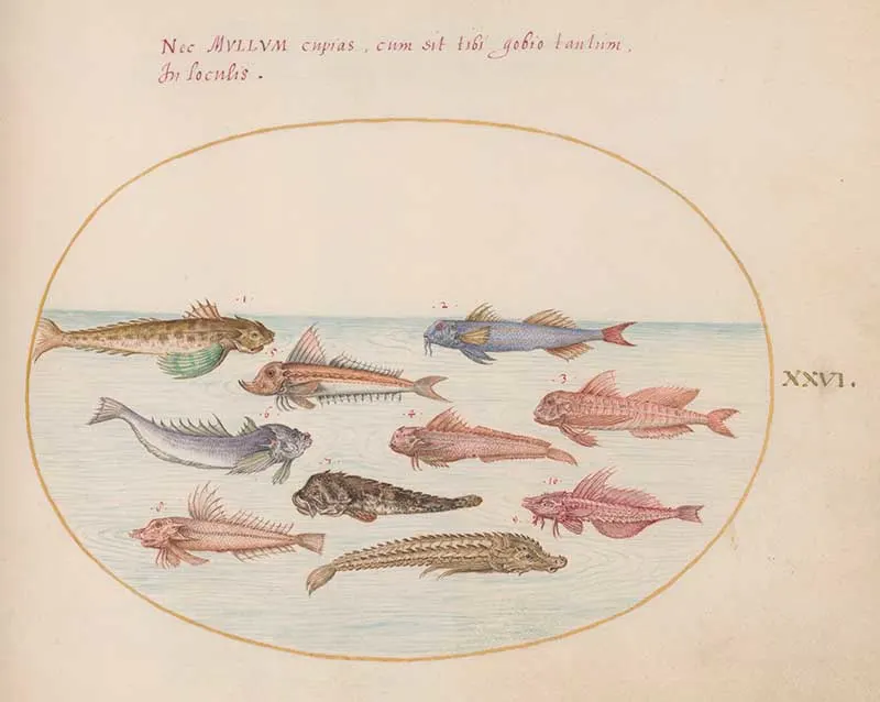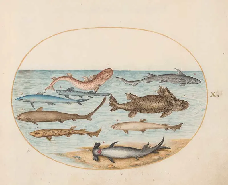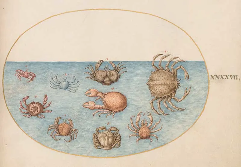 The Water element features marine life, molluscs, and amphibious creatures, reflecting the mysteries of the ocean and freshwater habitats. From fish and crabs to shells, Hoefnagel captures these creatures’ movement and delicate structures with remarkable precision. This collection highlights the Renaissance fascination with the sea, a vast and largely uncharted world.