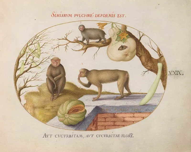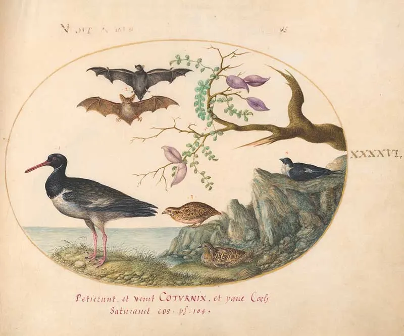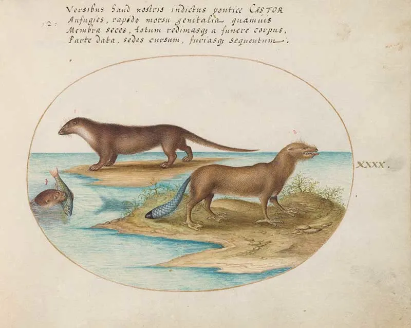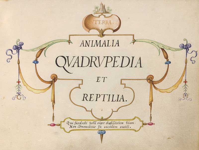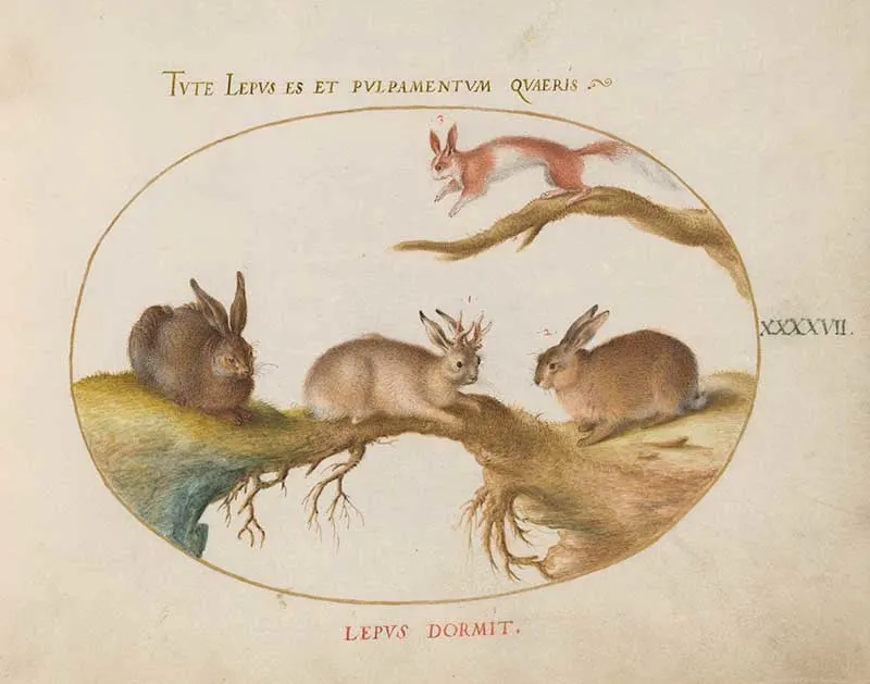 The Terra Plate of Joris Hoefnagel’s Four Elements series features a hare, a “jackalope” (a mythical creature with the body of a hare and antelope horns), a rabbit, and a spotted squirrel. The “jackalope” reflects the Renaissance fascination with real and mythical creatures.