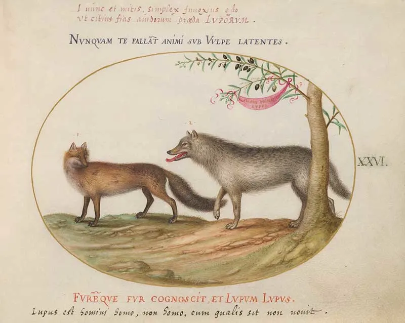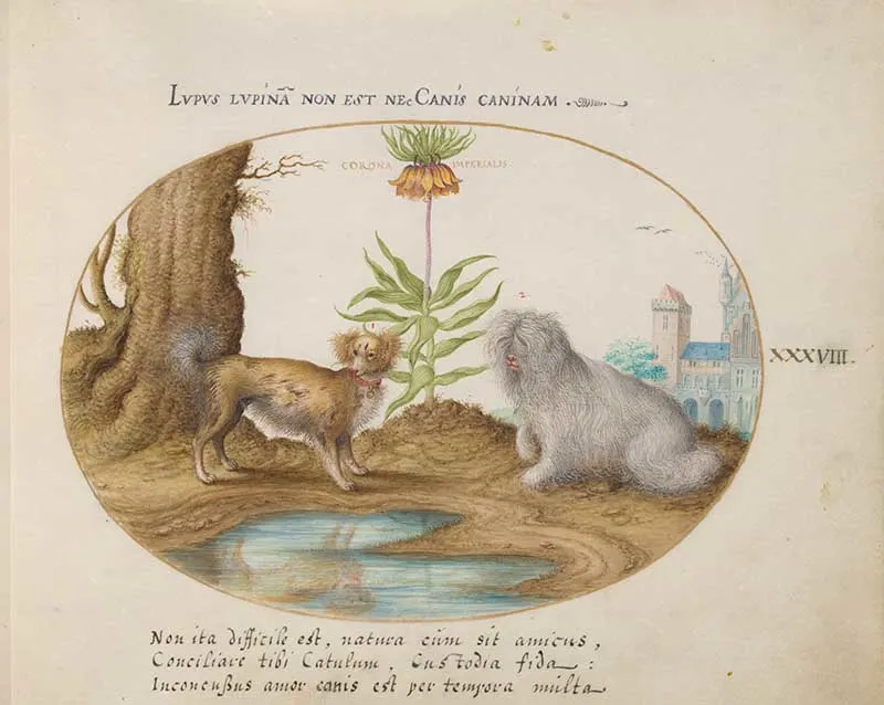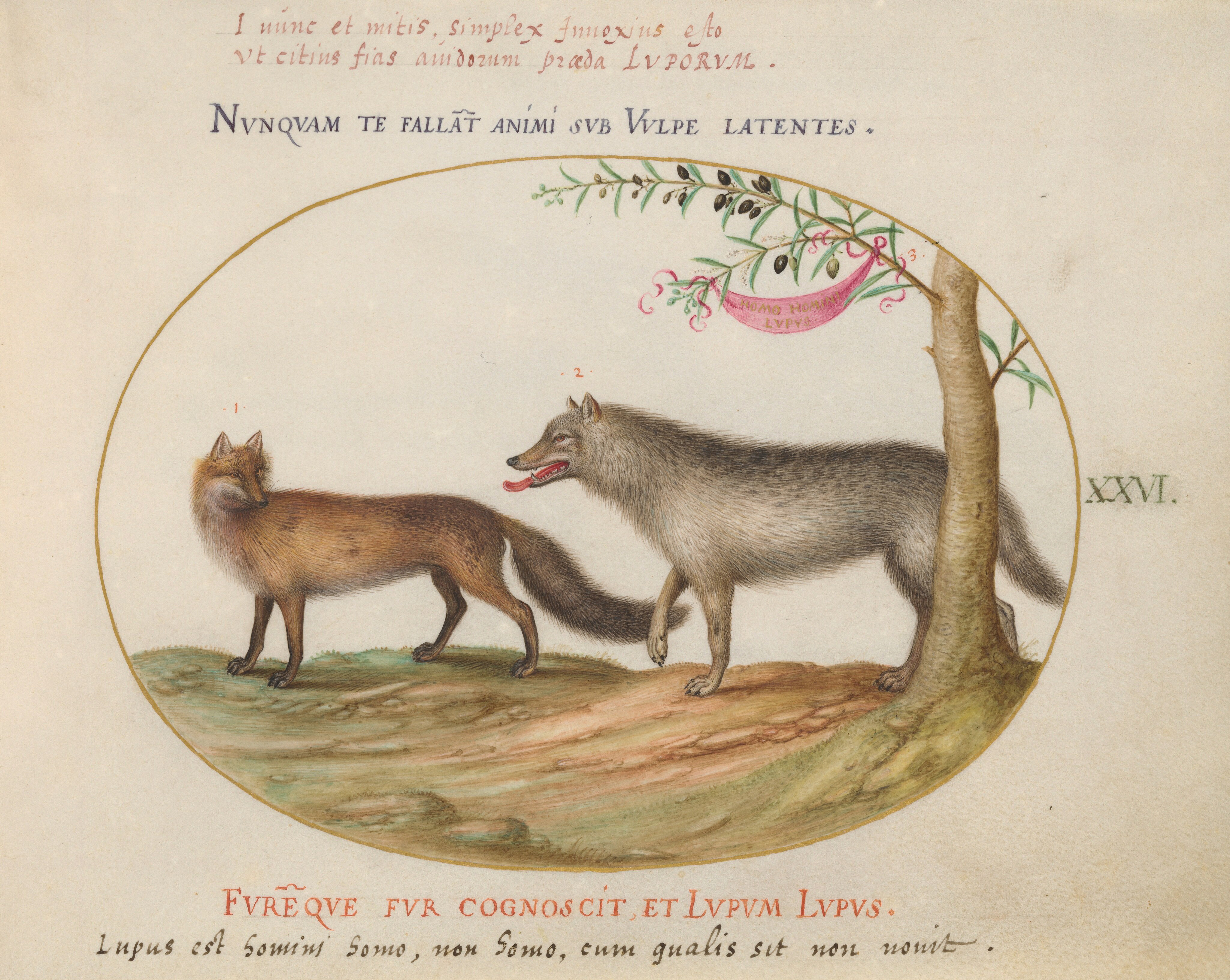 The inscription on this plate of Joris Hoefnagel’s Animalia Quadrupedia et Reptilia (Terra), part of his Four Elements series”LVPVS LVPINA[M] NON-EST NEC CANIS CANINAM.” translates to “The wolf does not belong to the wolf tribe, nor the dog to the dog tribe.”