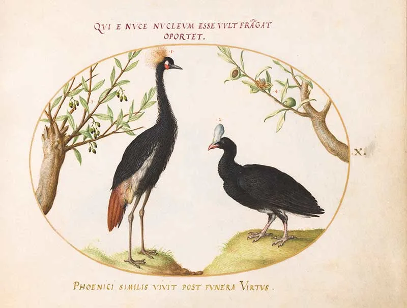 Print 44: Grey Crowned Crane and Helmeted Curassow