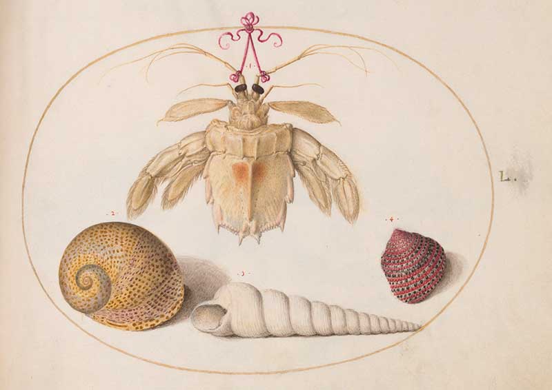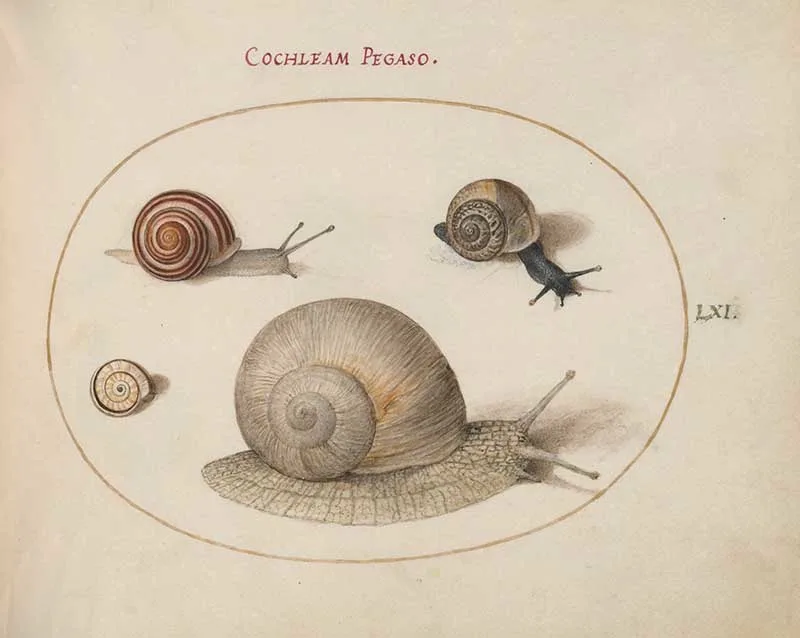 Joris Hoefnagel classified snails under the Earth (Terra) element in his Animalia Quadrupedia et Reptilia (Terra) volume rather than the Water (Aqua) element. This categorisation may seem surprising, as many snails are associated with moist environments. Still, it aligns with Renaissance-era classification systems, which often grouped land-dwelling molluscs alongside quadrupeds and reptiles rather than strictly aquatic creatures.