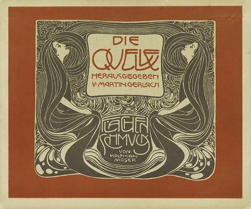 Text in red: Die / Quelle / Herausgegeben / v. Martin Gerlach; in white on black ground: FLACHEN / SCHMUCK / VON / KOLOMAN / MOSER. Black and white depiction of two women standing in profile with long hair intertwined on either side of text block. All framed by red border.