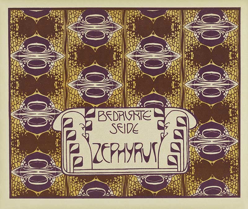 Koloman Moser Art Nouveau pattern Zephyrus Printed SilkPattern of split seed pod-like forms in purple, brown and orange.