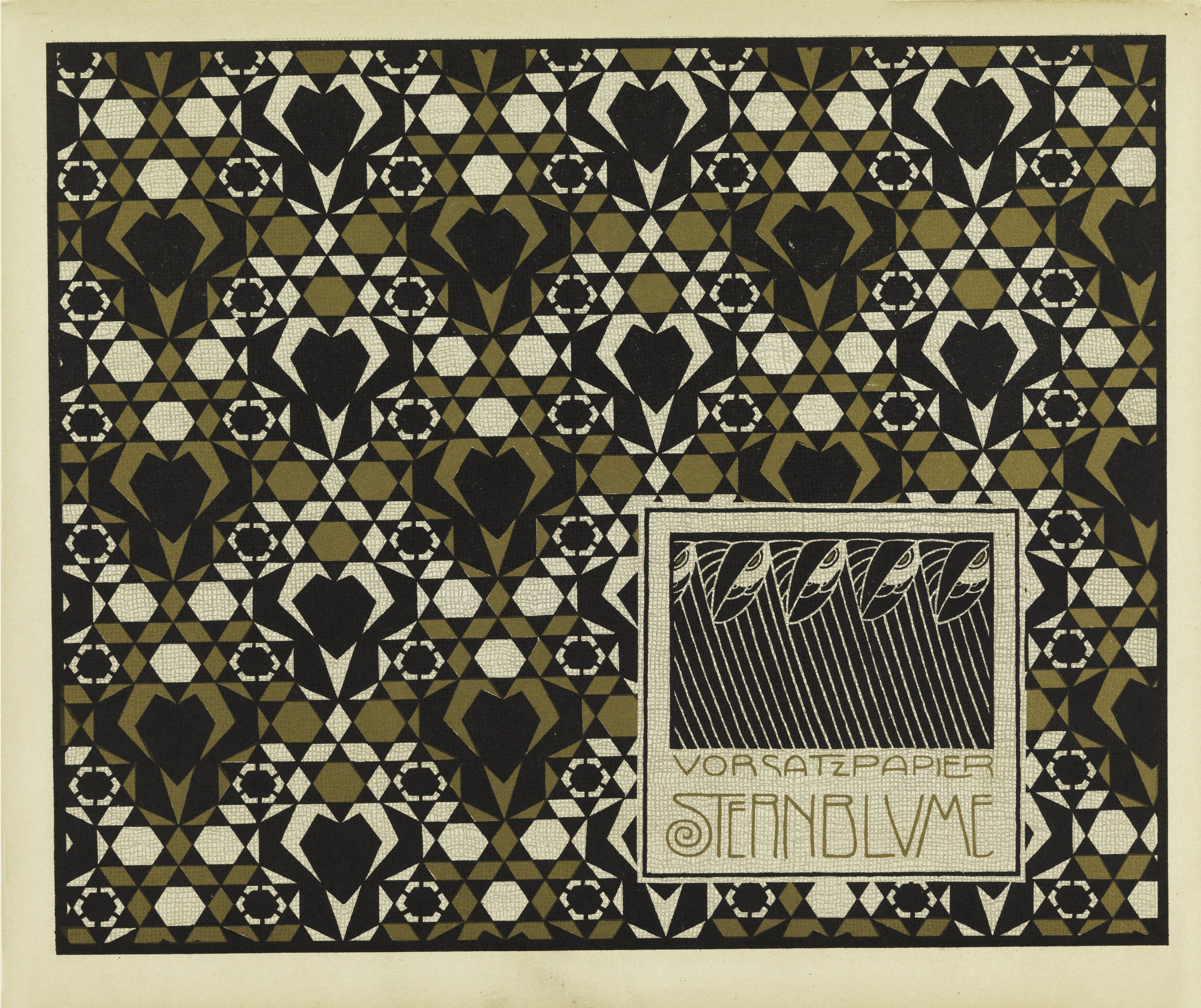Abstract geometric pattern of diamonds, hearts, flowers in black and gold on cream, creating a kaleidoscope effect. Box in lower right contains bird's head and leaf on stems motif in black with text in gold: VORSATZPAPIER / STERNBLUME. Verso: Title of portfolio in text block in gray, upper left. Pattern of flowers, squares, triangles, circles in gray on cream.