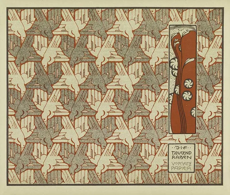 Pattern of geometrically-designed birds in gray and red outline. Kolomon Moser