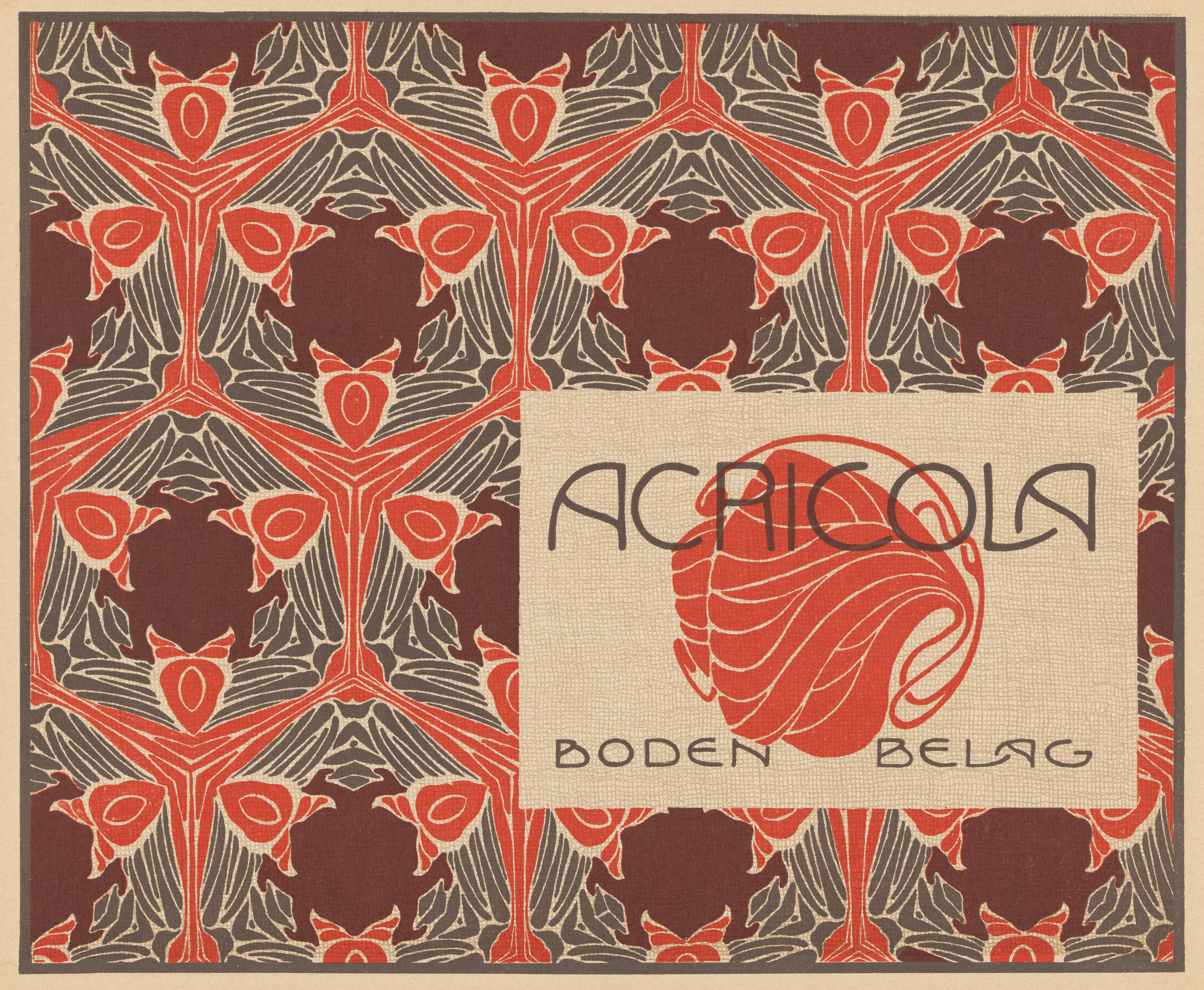 Art Nouveau Print: Abstract pattern of shell, leaf, bean-shaped motifs in turquoise and orange-red. Lower center, box with text in orange-red and turquoise: