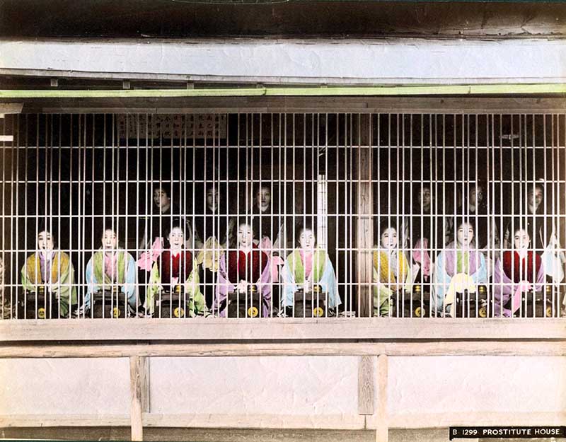 A beautifully coloured photo by Kusakabe Kimbei of a group of prostitutes in Yoshiwara. Yoshiwara was a well-known red-light district in Edo, present-day Tokyo.