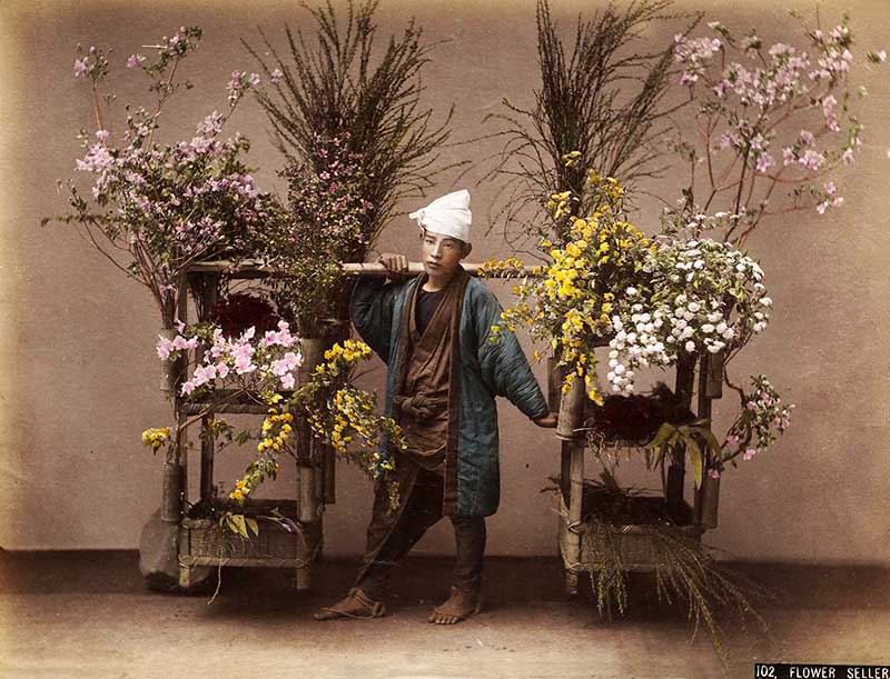 I like how the delicate flowers have been coloured in this Kusakabe Kimbei photo of a flower seller—another stunning vintage photo of Japanese everyday life.