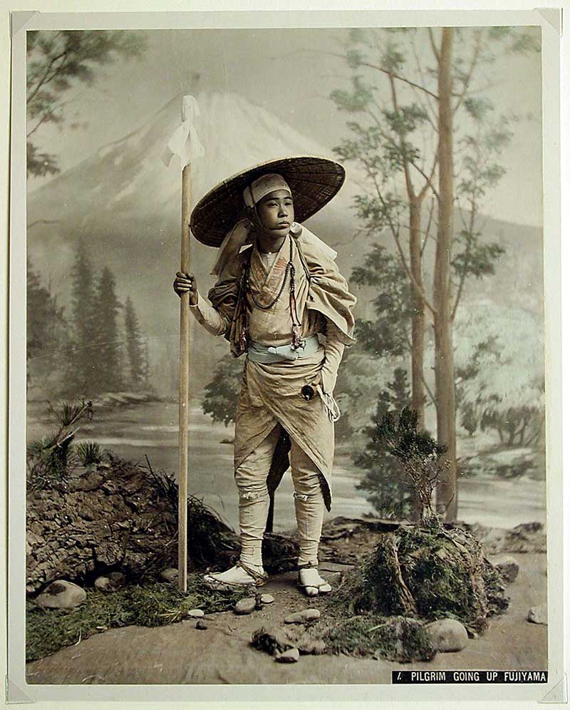 This old Japanese photo by Kusakabe Kimbei is of a pilgrim in a traditional dress about to climb Mt Fuji.