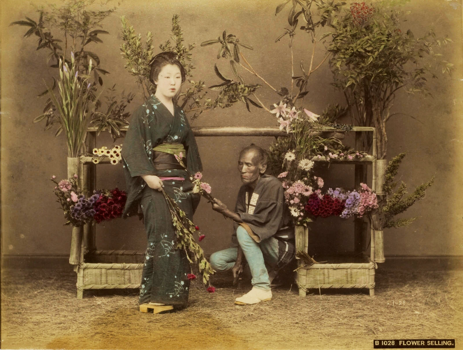 Another vintage colourized Kusakabe Kimbei photo of someone selling flowers.