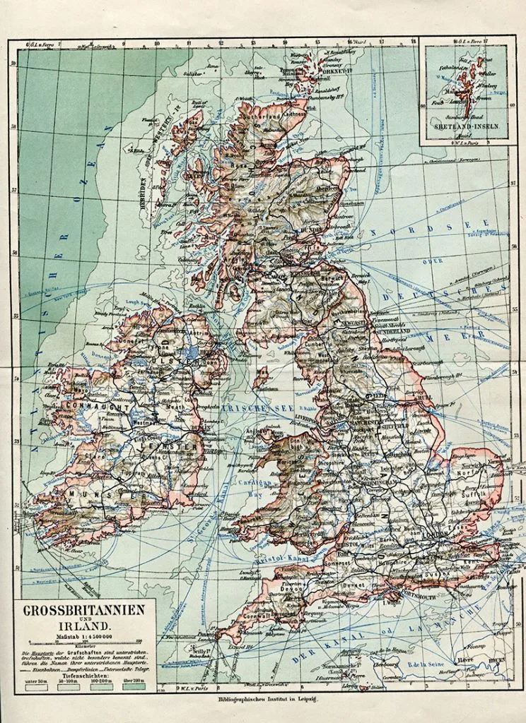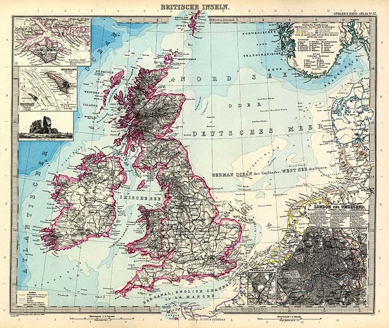 The map is actually one from my own collection. It was originally from a German Atlas, that’s why all the place names are in German. It could be called a vintage map of the British Isles as includes Ireland, however, I can’t see the Chanel Islands which are also part of the British Isles. That’s why I titled as an old map of Britain and Ireland.