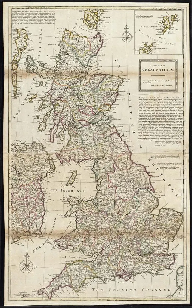 The map is actually titled “A new map of Great Britain according to the newest and most exact observations” It was created by the geographer Herman Moll and the original map is in the Boston Library.