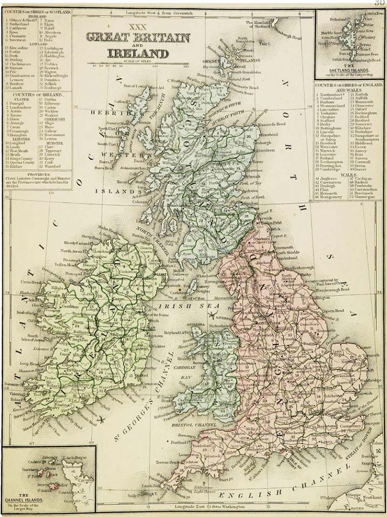 A lovely map of Britain and Ireland it also includes the Channel Isles. The map has lovely detail, including listing all the counties for each country, Scotland, England, Wales and the whole of Ireland North and South.
