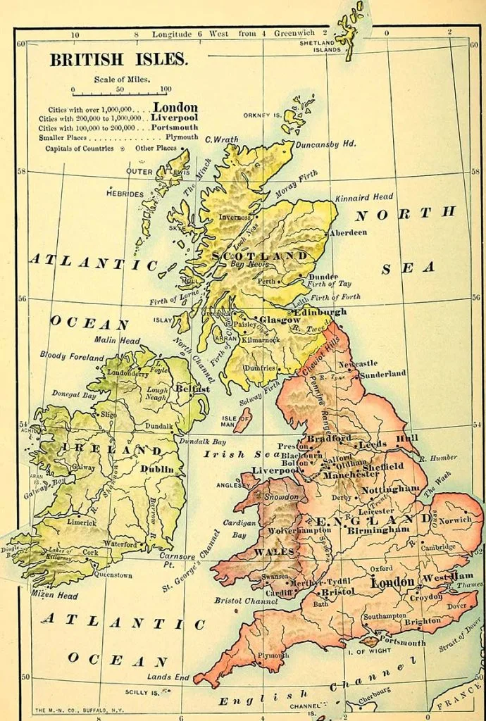 A lovely simplified map of the British Isles from 1901. There is not too much information on this map and each country, Scotland, England Wales and Ireland is a different