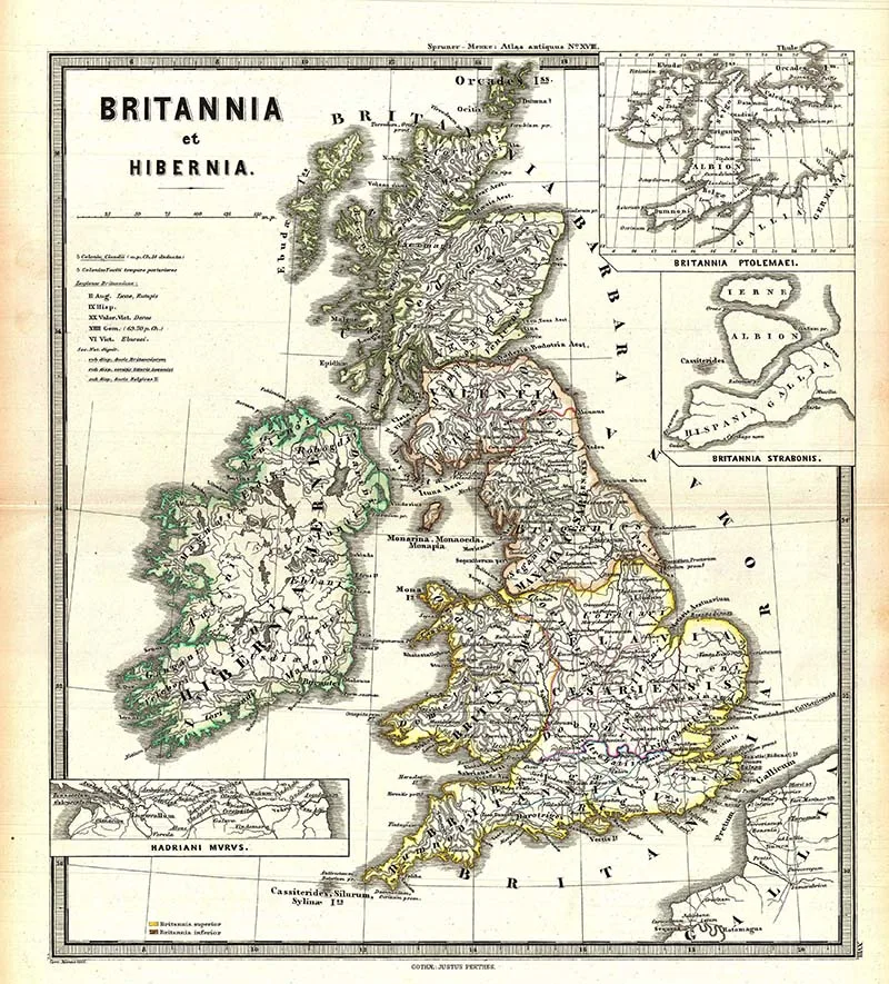 Britannia is the Roman name for Britain and Hibernia is the Roman name for Ireland. This is Karl von Spruner’s 1865 map of Briton, and Ireland (Britannia et Hibernia). The antique map includes the names of ancient tribes and peoples and the areas they inhabited. There is also an inset detailed map of Hadrian’s Wall on the map.