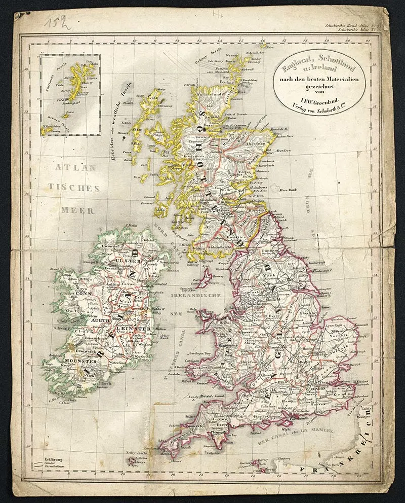 I don’t know much of this rather beaten up old map of Britain and Ireland, except that it is a German map published in 1856.