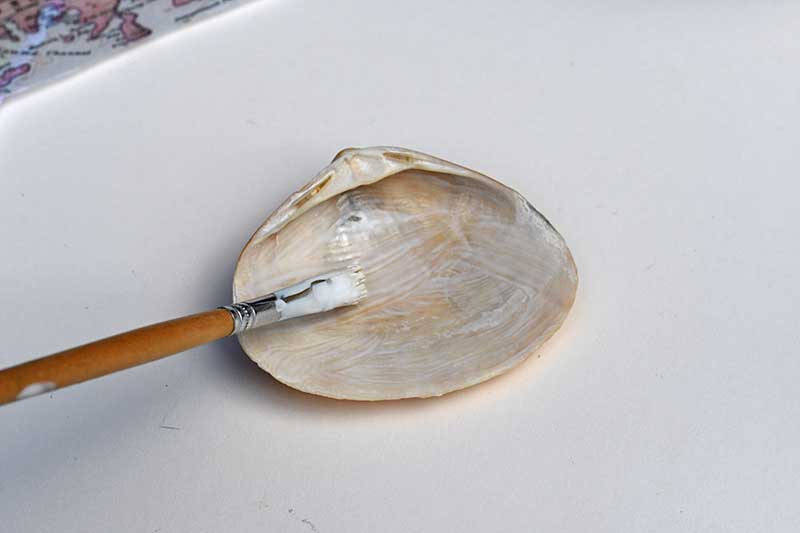 4. Next, prepare the seashell by coating the inside with Mod Podge with a brush.