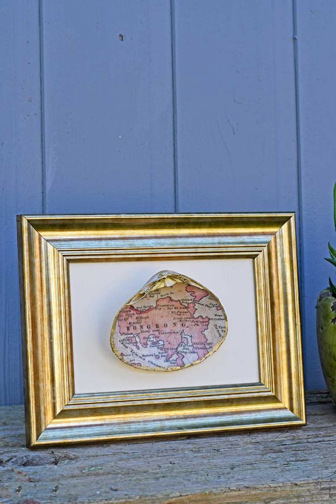 I made a unique seashell gift for Christmas by decoupaging maps of our favourite coastal towns onto the inside of a seashell and then framing it.