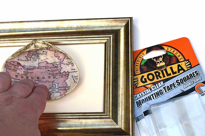8. Finally, to finish off the map seashell gift, apply some gold gilt paint to the edges. Then using Mounting Tape Squares mount the seashell gift into the photo frame.