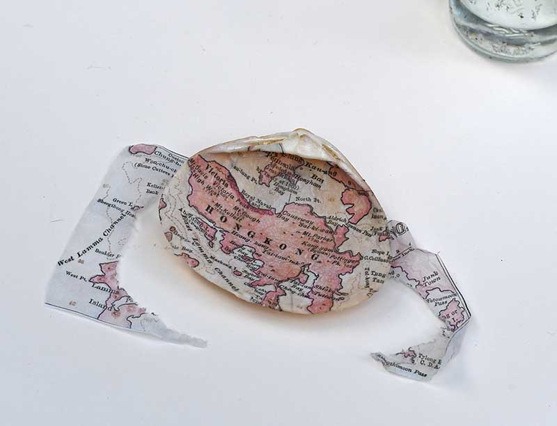 7. Next, apply a coat of Mod Podge on top of the printed map on the shell. Leave it to dry and this will provide a protective varnish.
