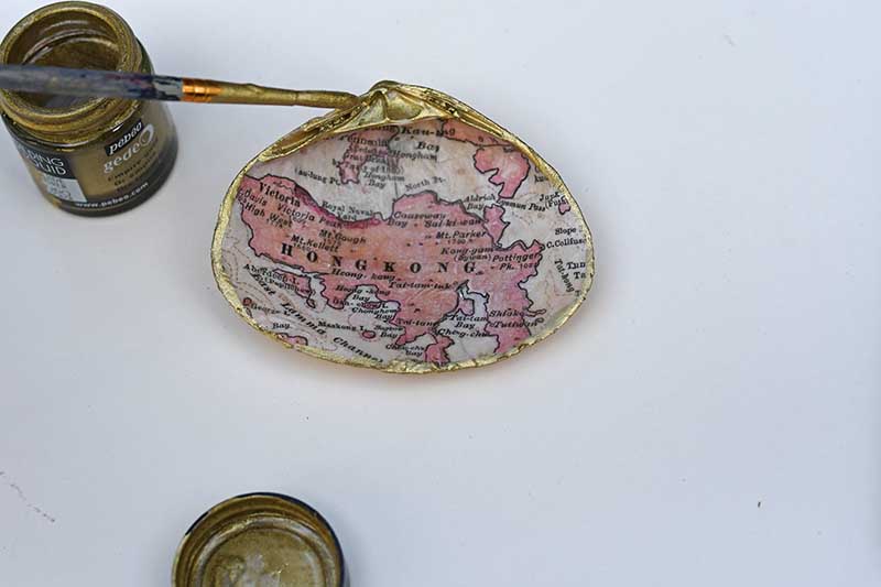 7. Next, apply a coat of Mod Podge on top of the printed map on the shell. Leave it to dry and this will provide a protective varnish.