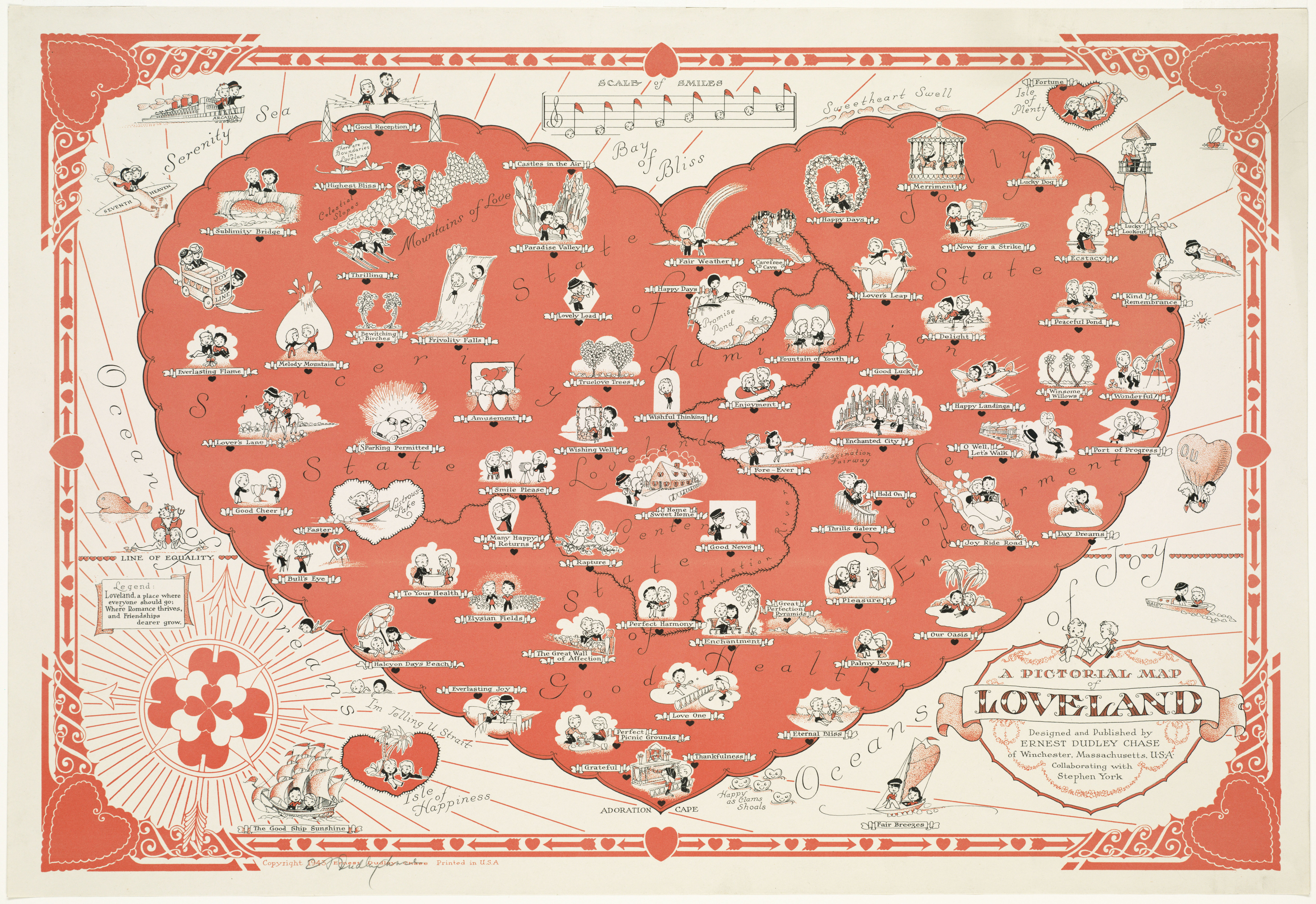 This collection includes a fictitious map of Loveland created by a greeting card designer from the 1940s, which has a valentine’s feel to it.