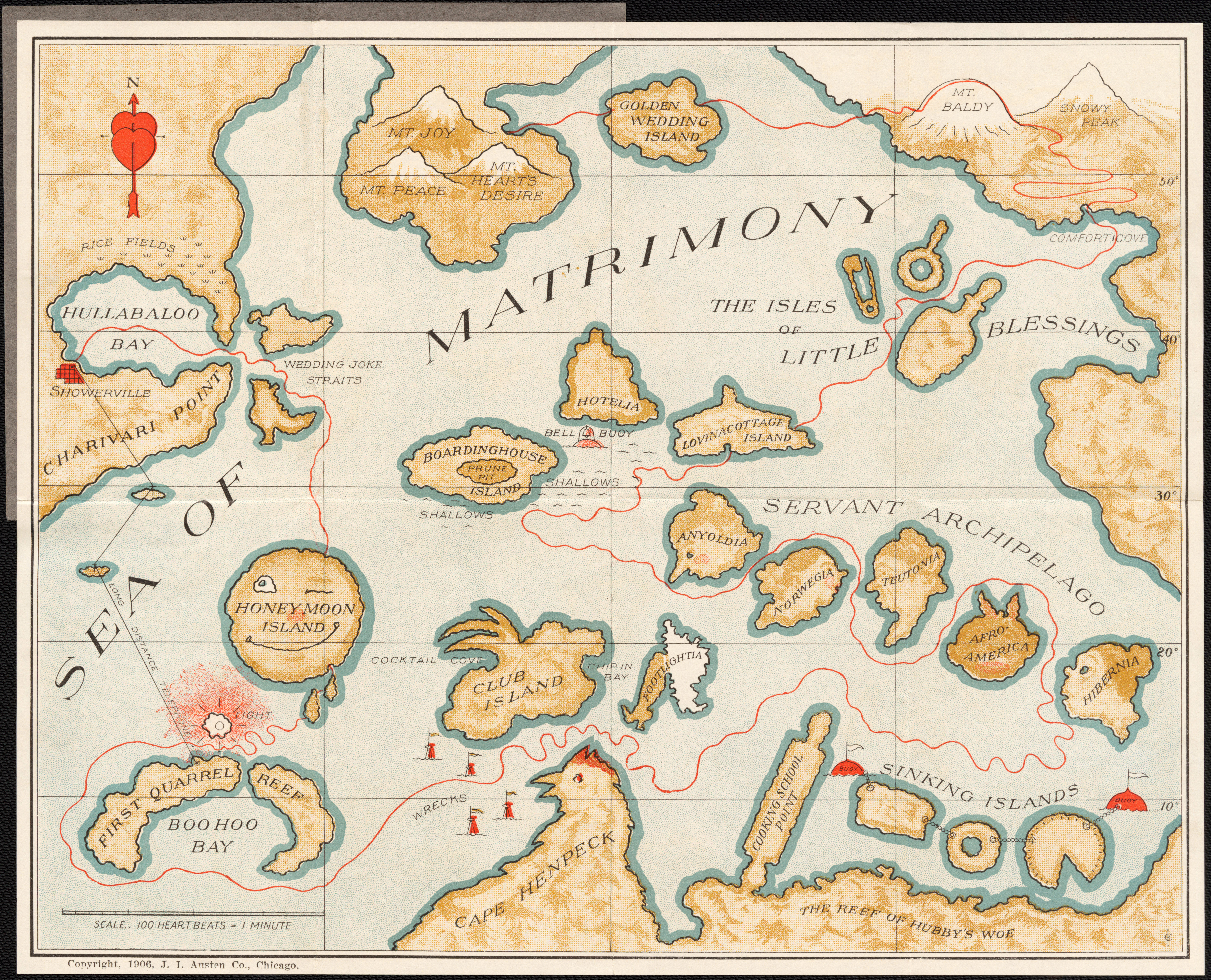 The map emphasized the dangers of marriage, the “Points of Peril for Matrimonial Mariners.