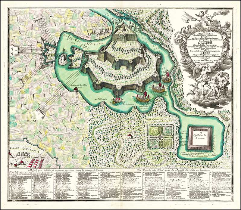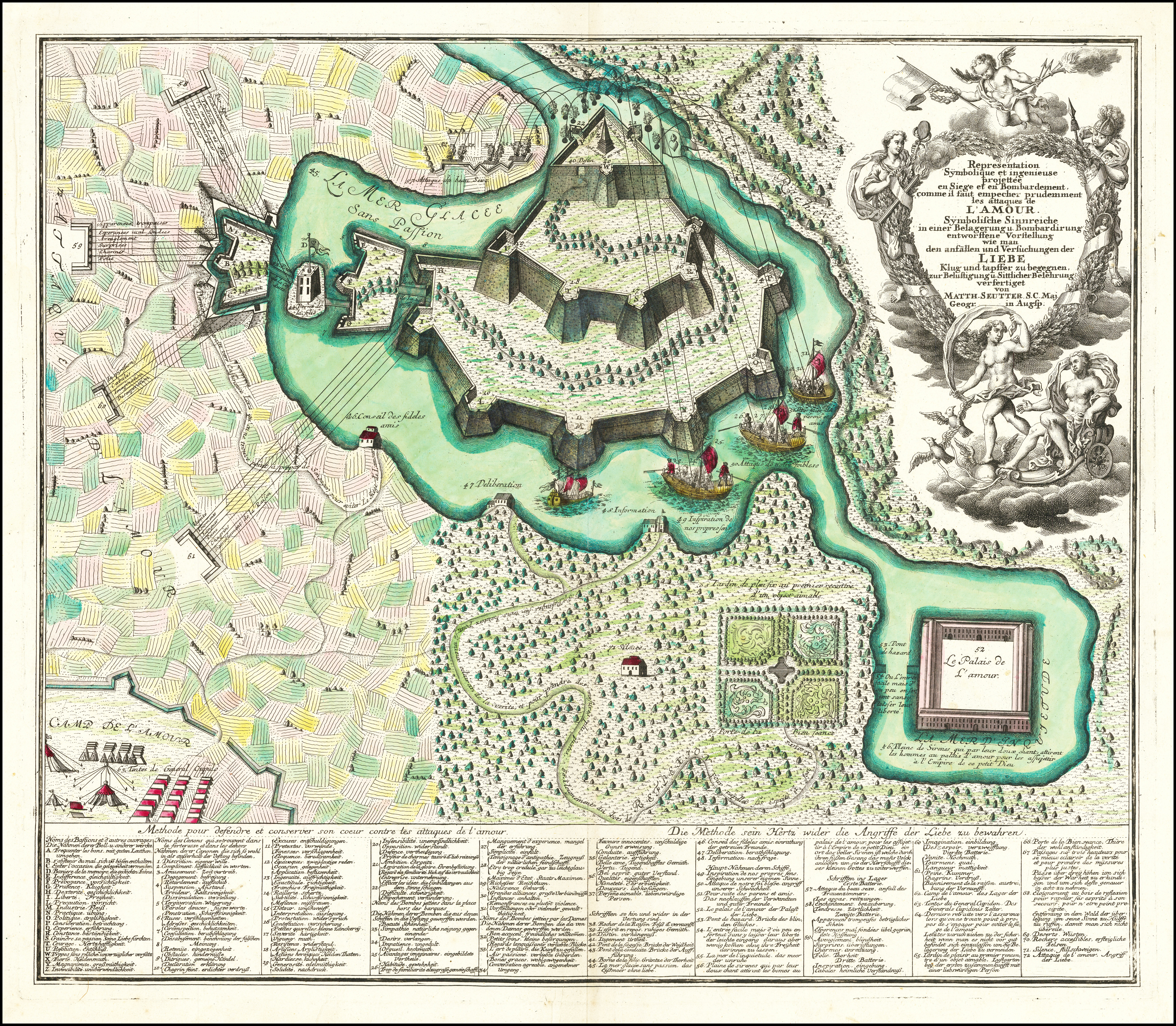 The map symbolizes the battle for the heart. The trials and tribulations of romantic entanglement. It was published by one of Germany’s greatest mapmakers of the 18th century, Matthias Seutter.