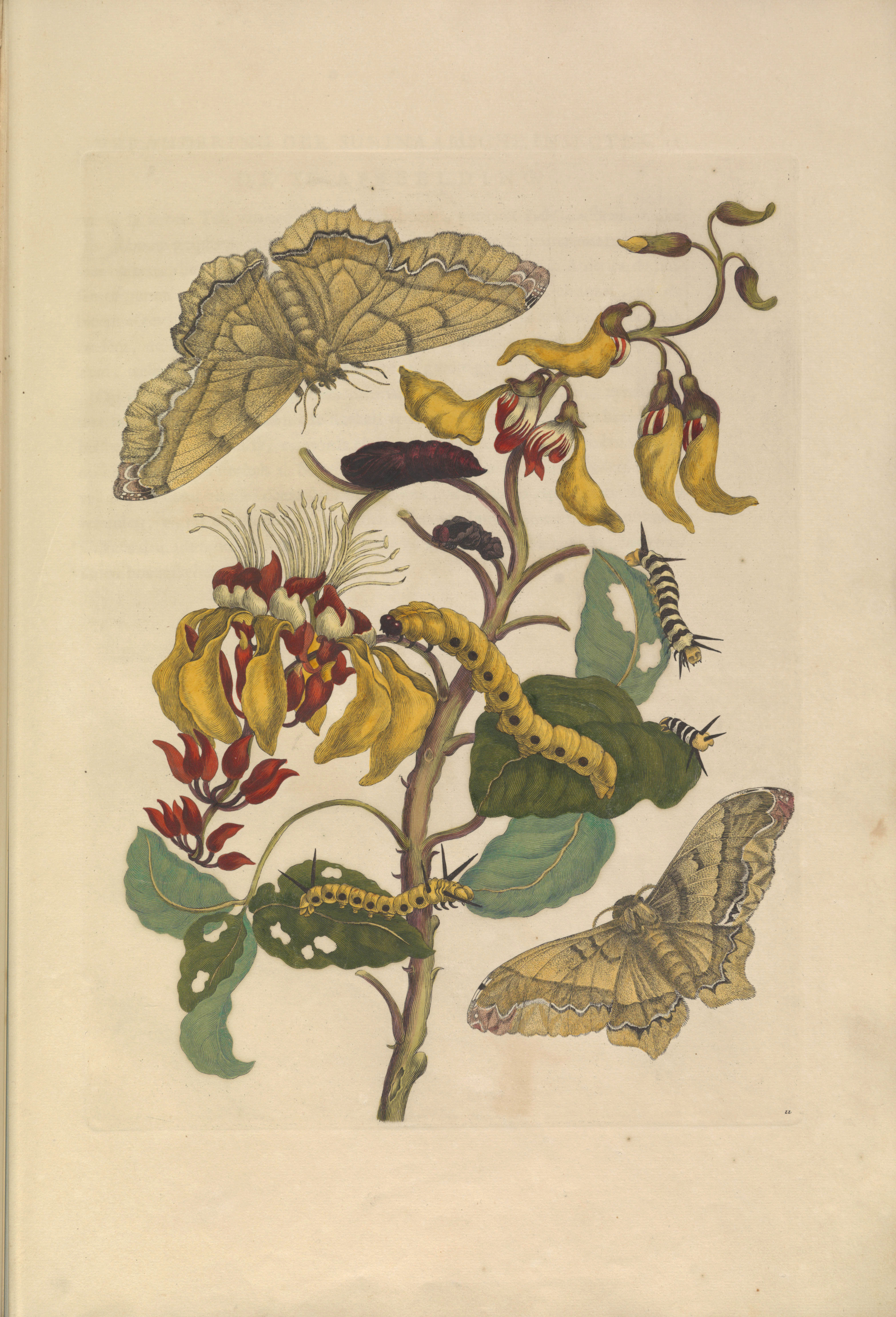 “In April I was up to Suriname on the plantation of Miss Soomelsdyk, called Providentia, where I made several observations of insects, while walking I found a multitude of Gummi Gutta Trees in the wild, of which I here represent a branch he washes almost like the birch trees in Europe … On this tree, I found this great caterpillar of green and black stripes …. Before the caterpillar was changed, the green turned to red, that is, before she became a doll after she had reached her full greatness.“