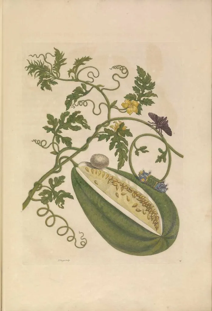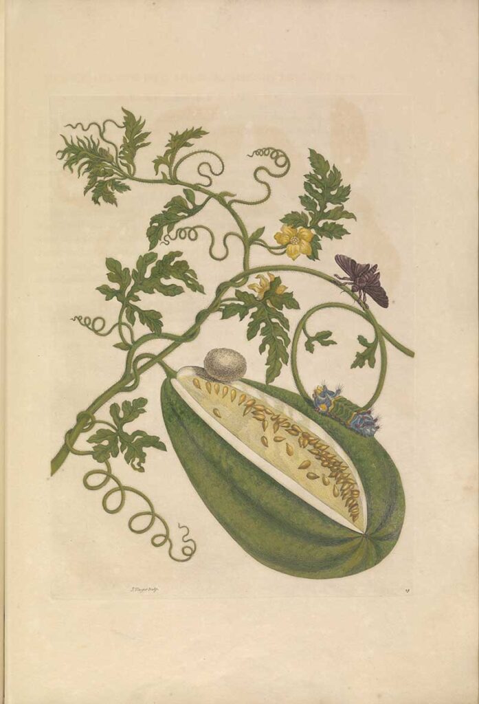 The text accompanying this Maria Sibylla Merian print describes the watermelon fruit as follows.