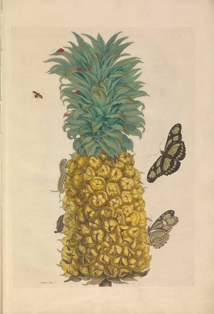 Maria Merian used a pineapple drawing for the cockroach metamorphosis illustrations. The insects love sweet food and thus are very fond of this fruit.
