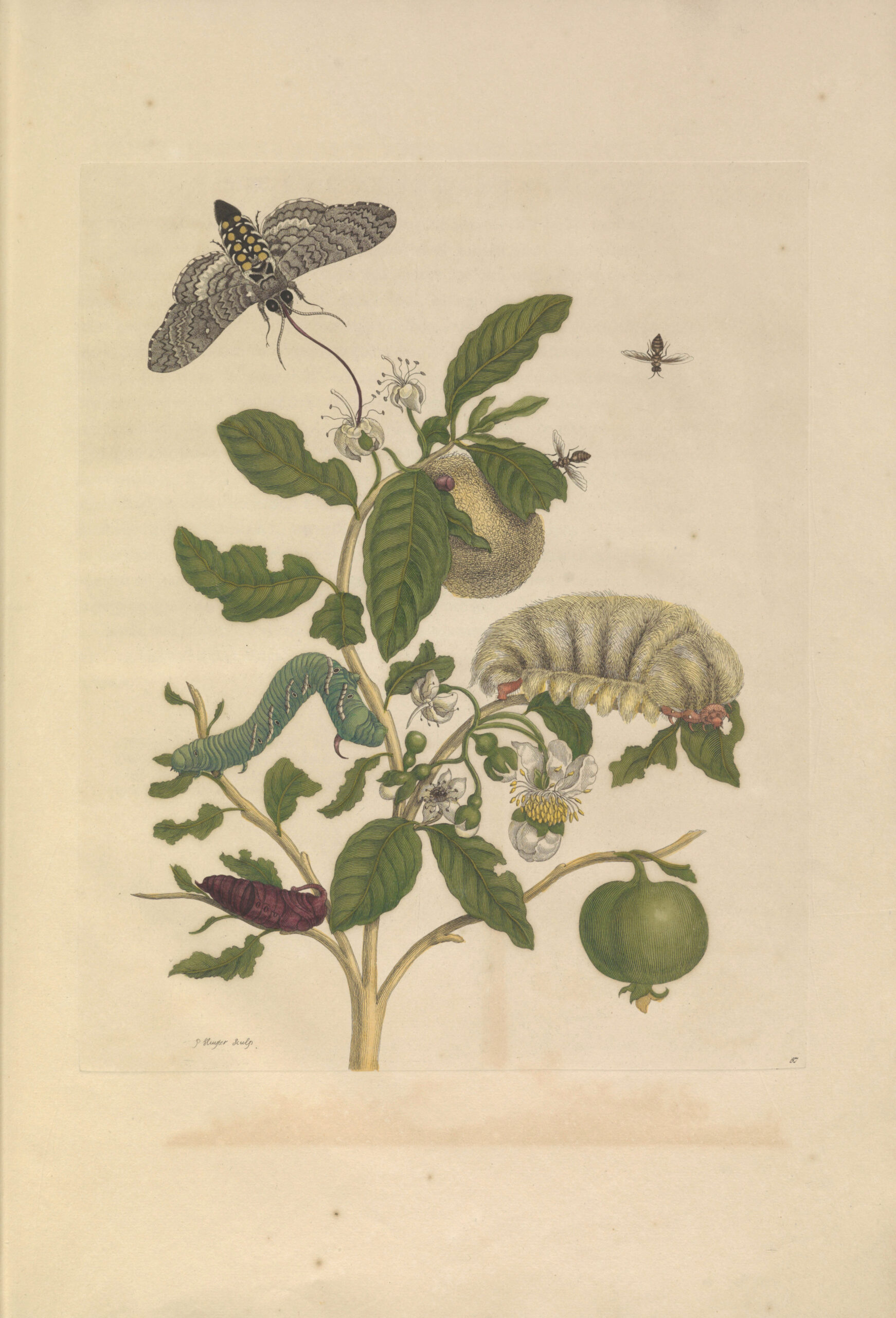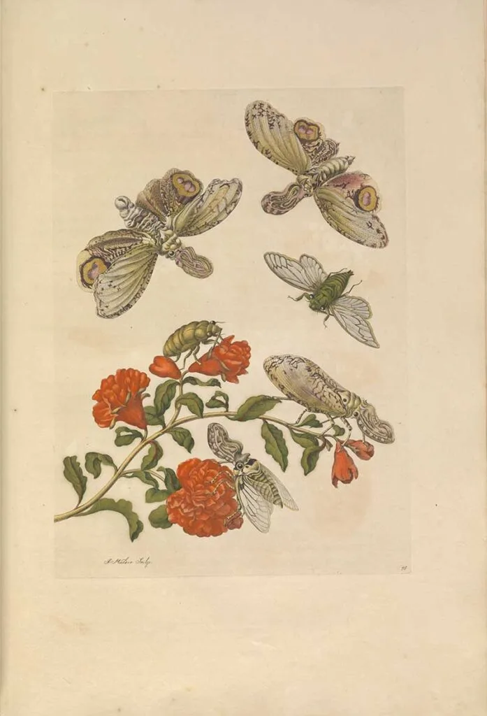Maria Sibylla Merian print of pomegranate flowers and insects the locals called Lantern-Bearers.