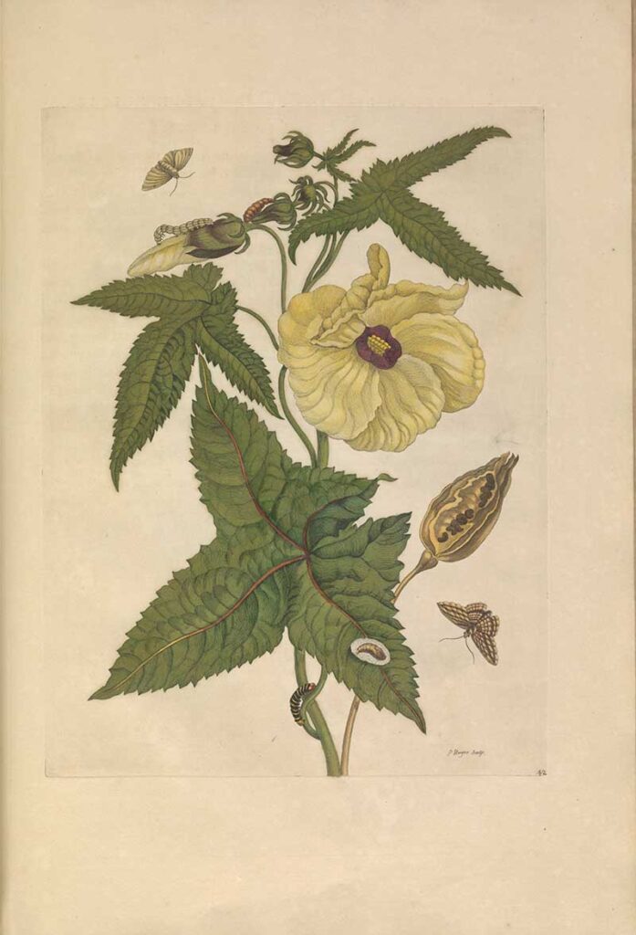 “Muscus Flower grows on a plant about eight feet high, the flower is yellow, has no smell at all, when it has fallen off grows a large seed-house, full of brown seeds inside, which have a very strong musk smell. have. The virgins thread them on the side, and tie them around the arms to adorn themselves with them in their own way; the leaves use them to fatten the young calcoens.“