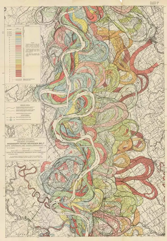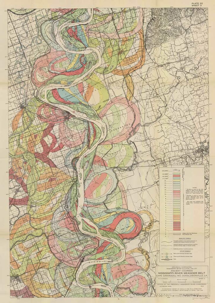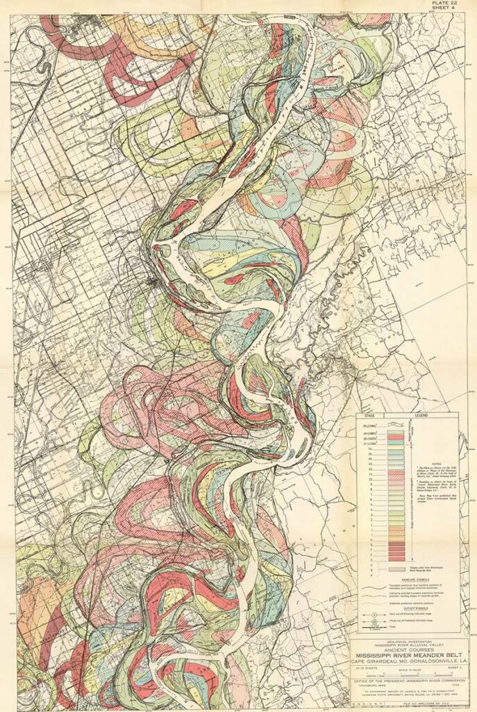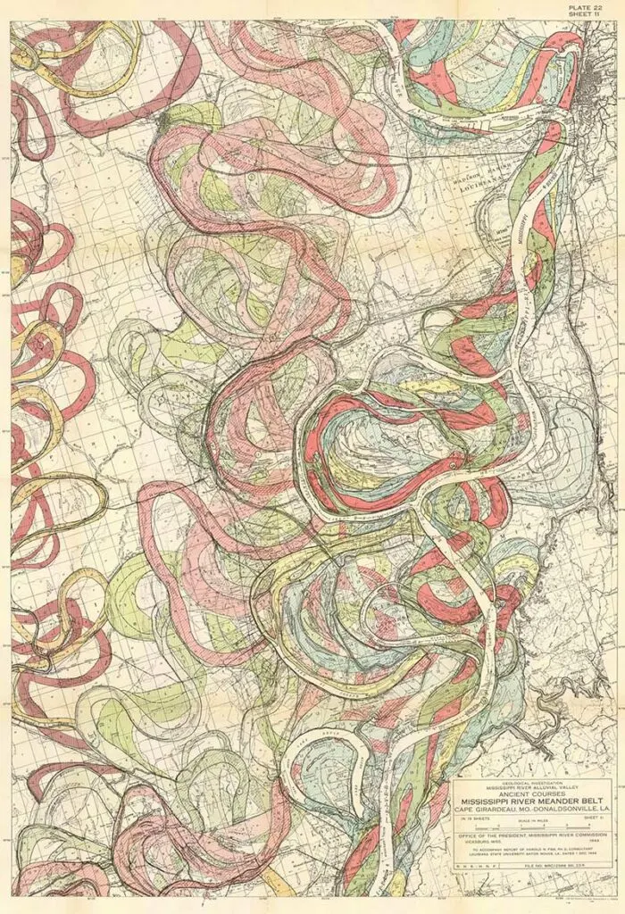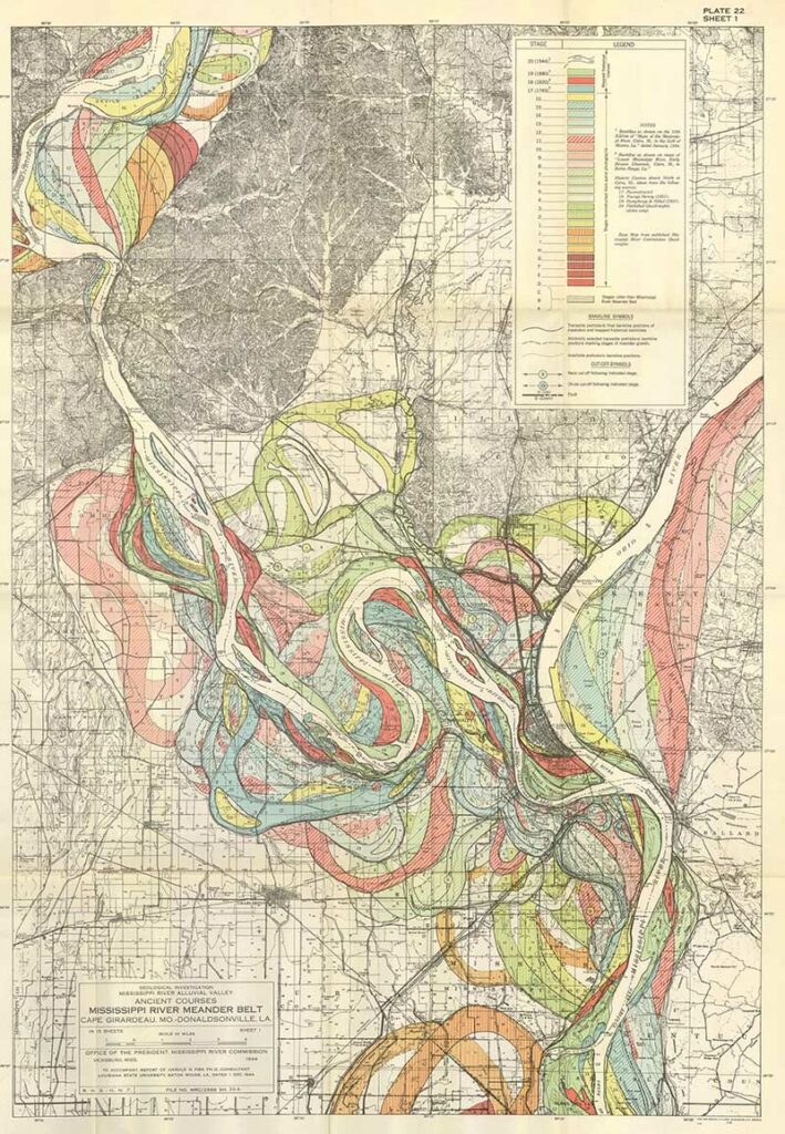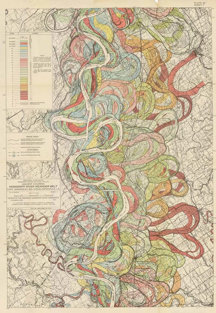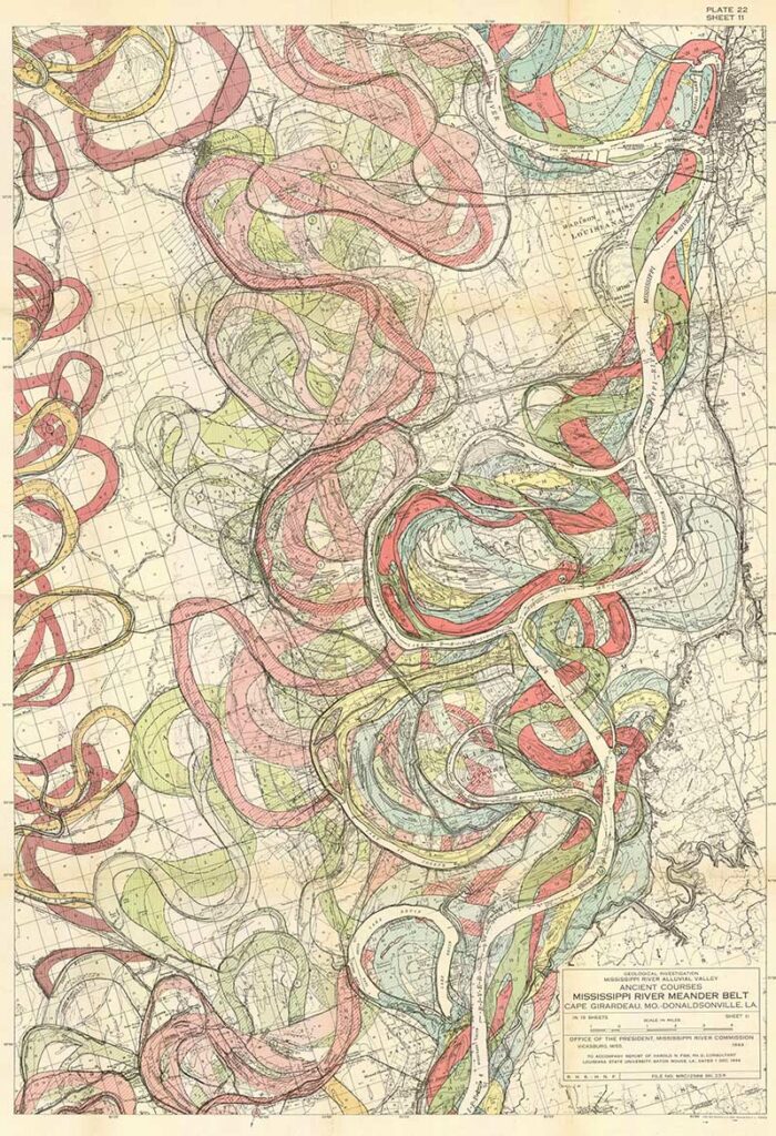 Harold Fisk was a geologist and cartographer employed by the US Army Corps of Engineers. In 1944 he published a rather bland government report “The Nature and Origin of the Alluvial Valley of the Lower Mississippi River”. There was a visual gem within this report, 15 colorful maps of the Mississippi River.