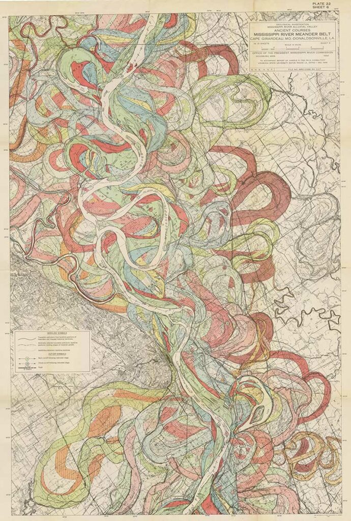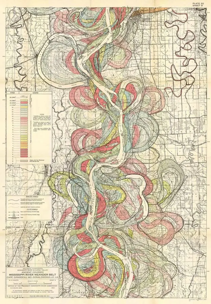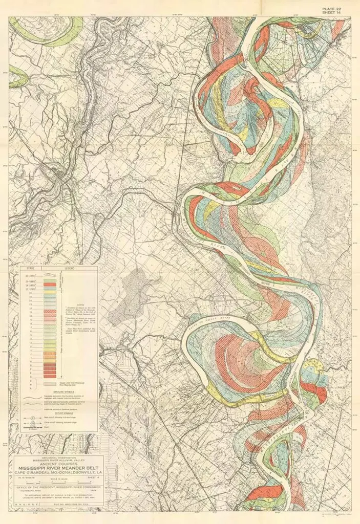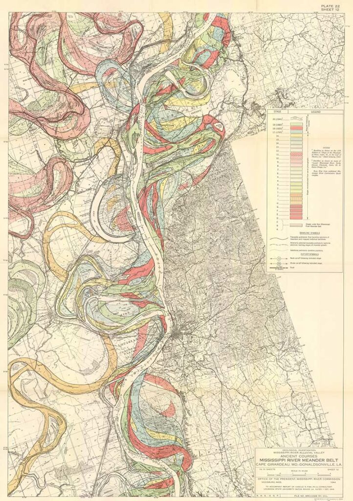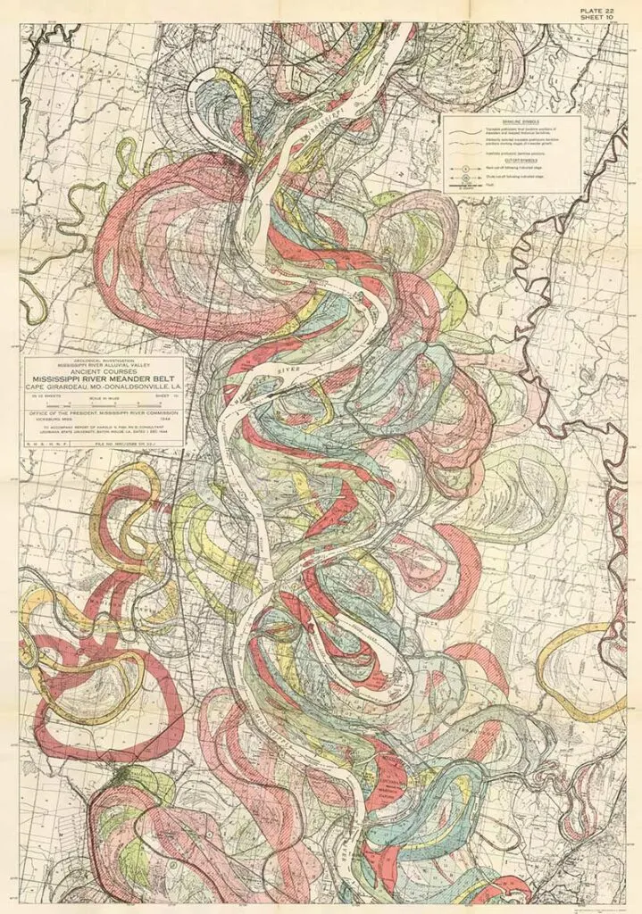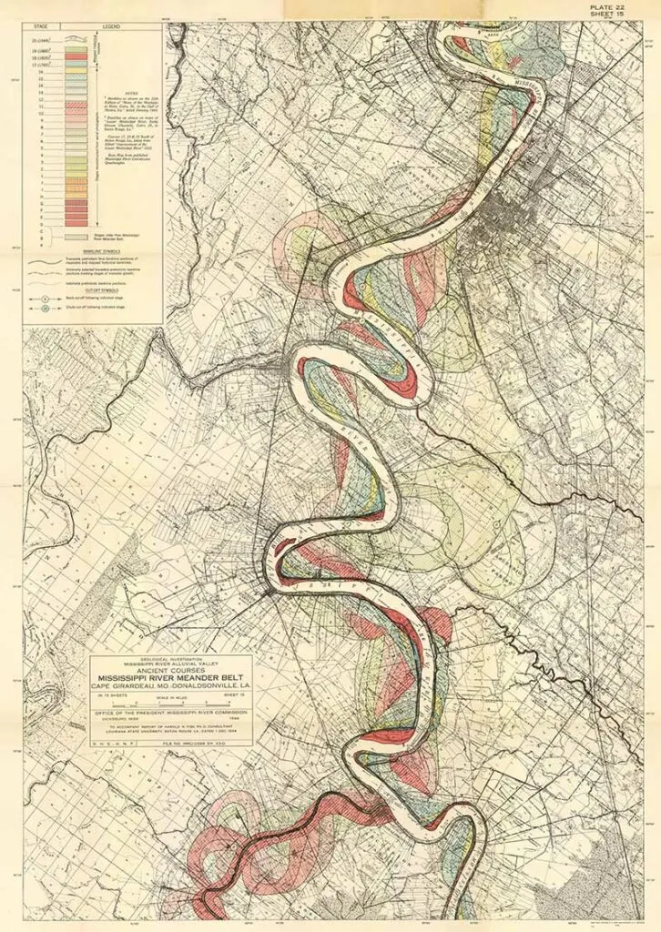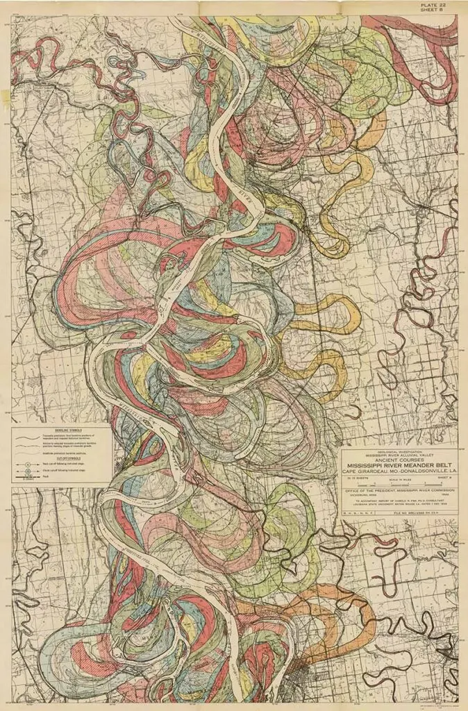 Harold Fisk was a geologist and cartographer employed by the US Army Corps of Engineers. In 1944 he published a rather bland government report “The Nature and Origin of the Alluvial Valley of the Lower Mississippi River”. There was a visual gem within this report, 15 colorful maps of the Mississippi River.