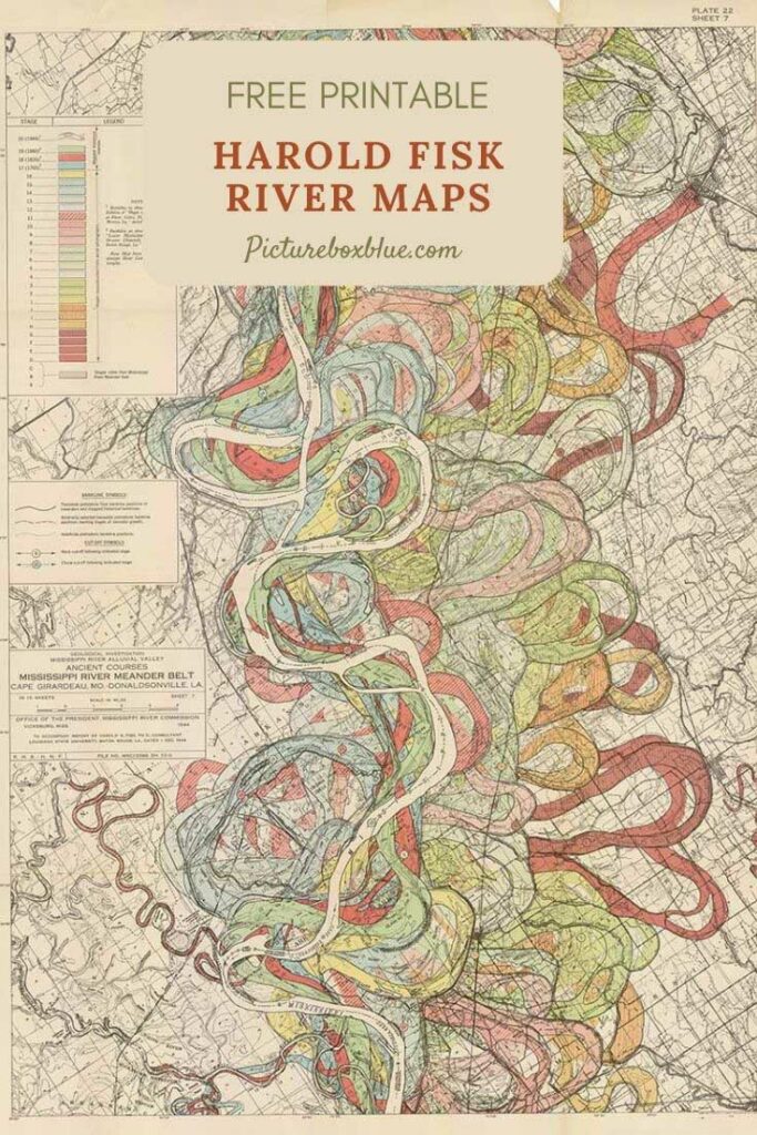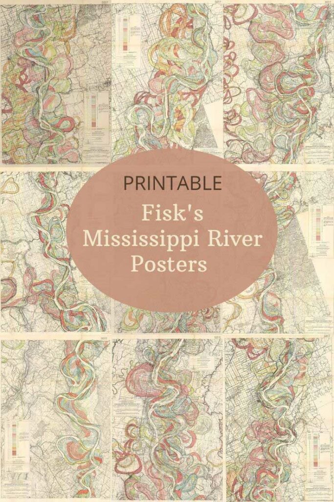 These maps of Harold Fisk are in the Public Domain. I have managed to find some good digital downloads of them. In my search, I also came across some other wonderful vintage Mississippi river maps. Which you can also download and print for free.