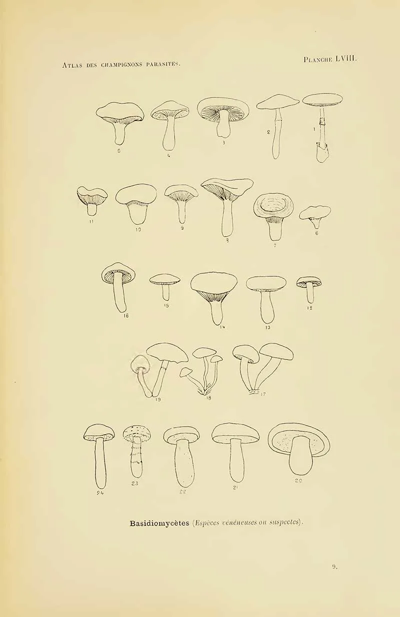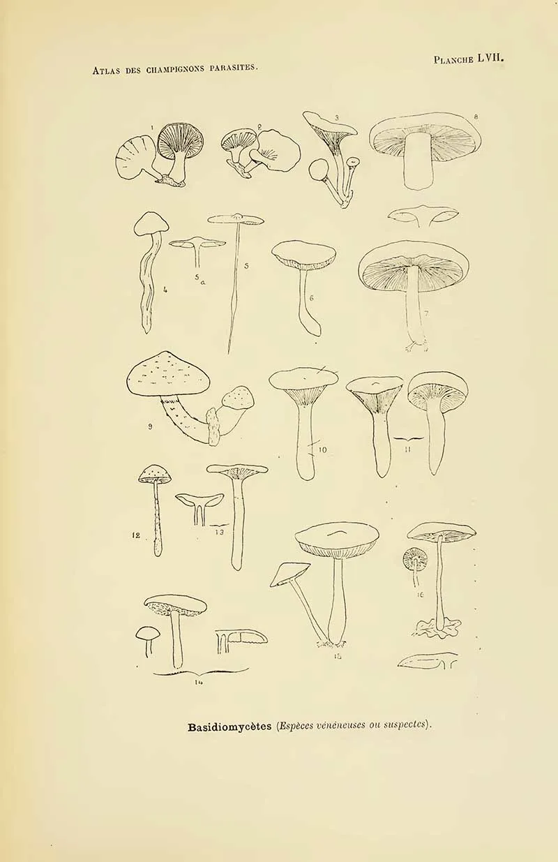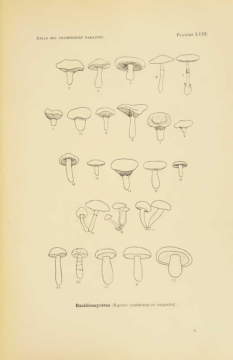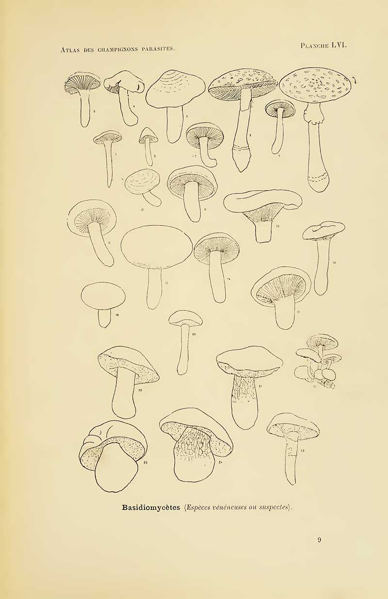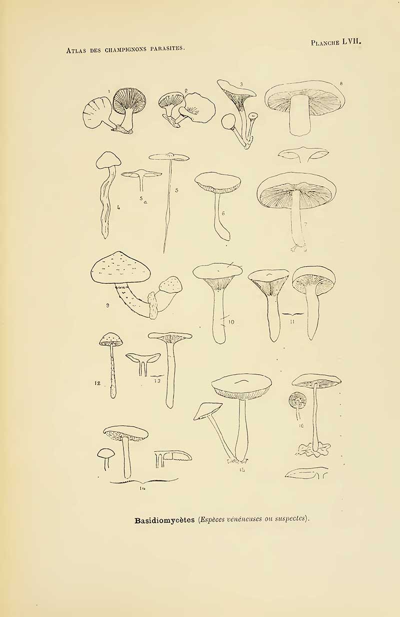 The first four sets of mushroom drawings are from the book “Atlas des champignons parasites et pathogènes de l’homme et des animaux“. This translates as “Atlas of parasitic and pathogenic fungi of man and animals.” Henri Coupin 1900.