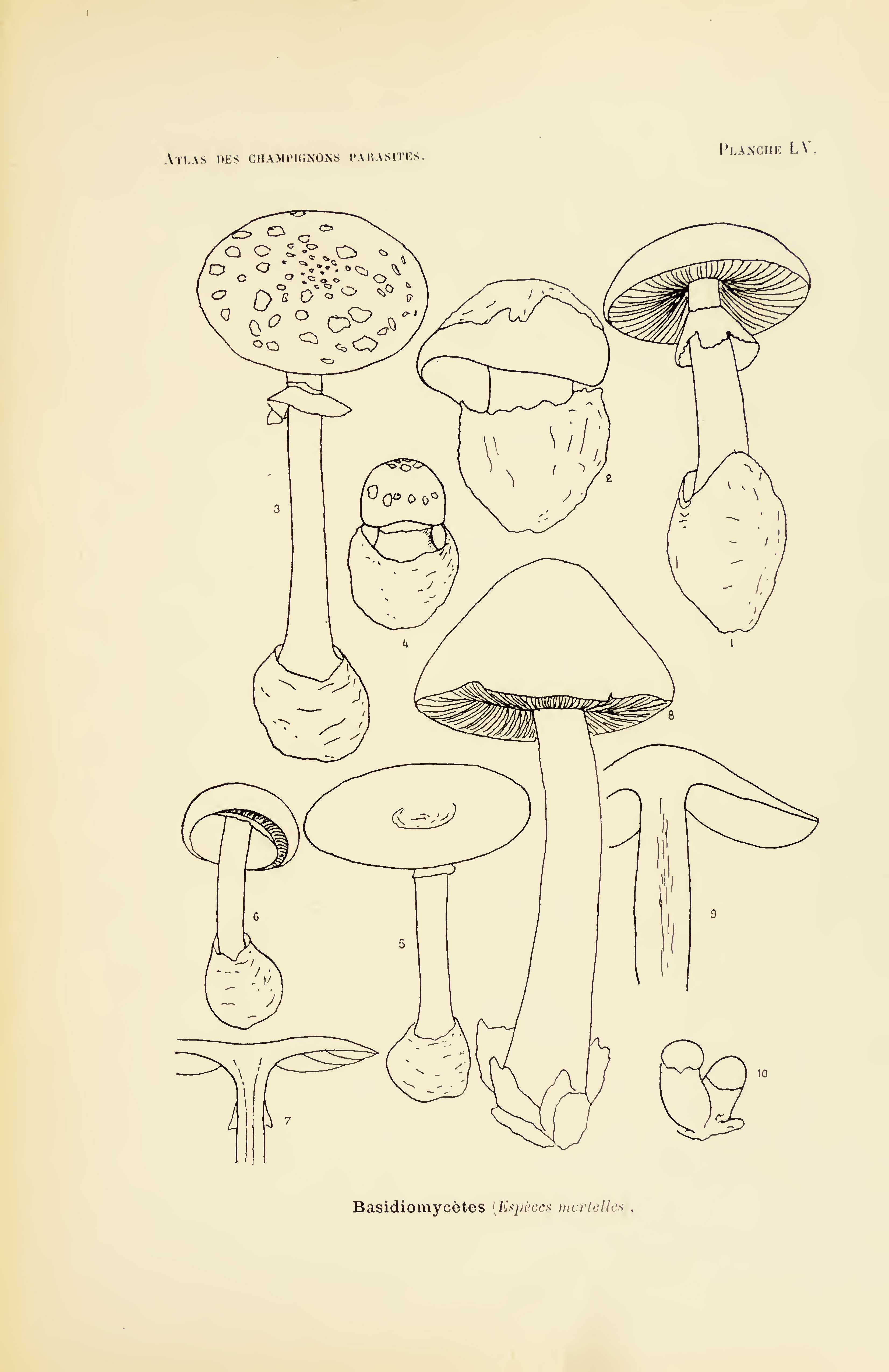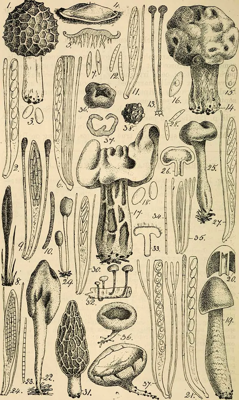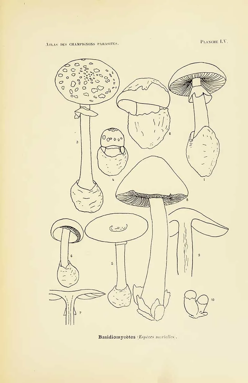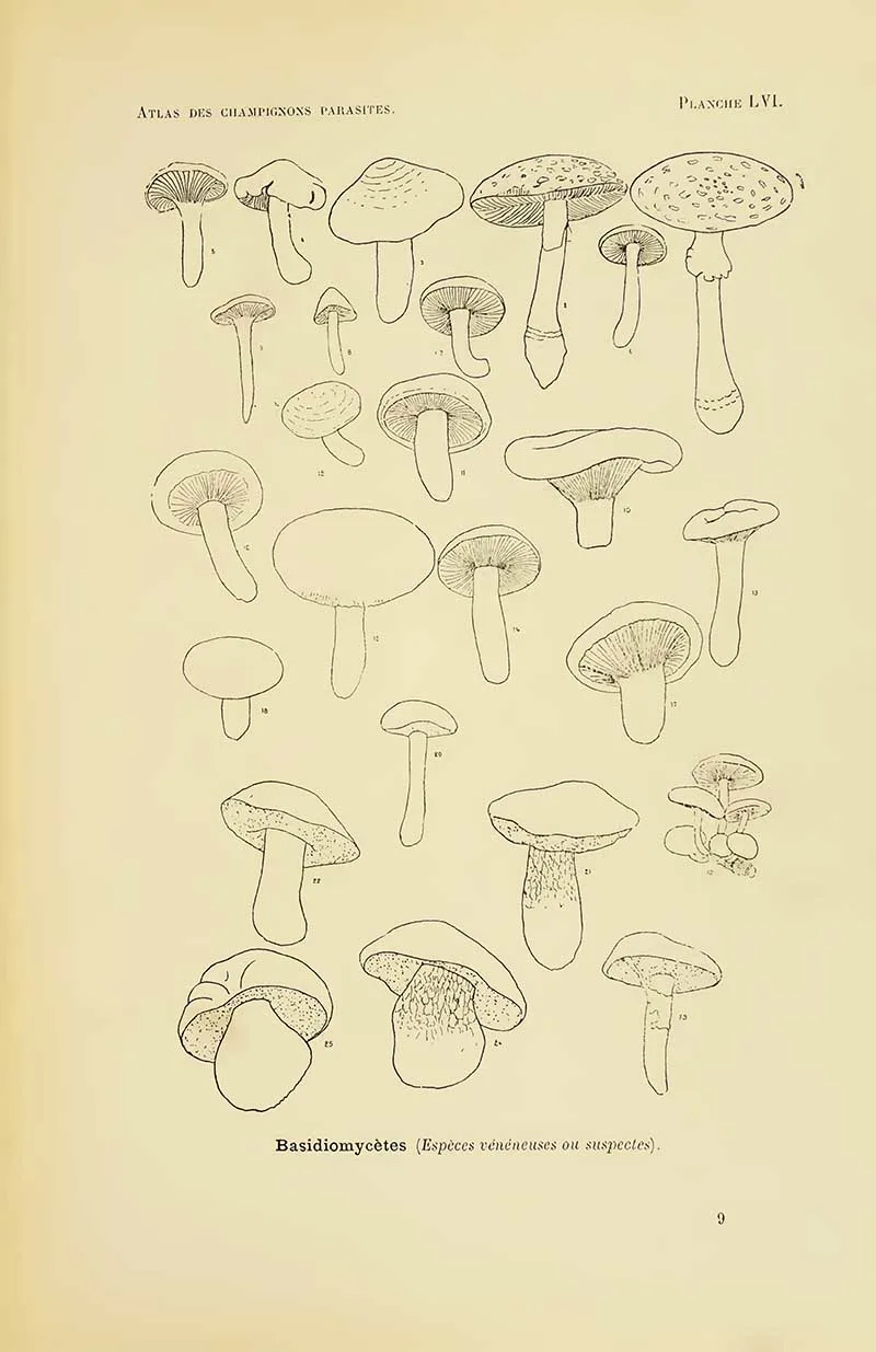 The first four sets of mushroom drawings are from the book “Atlas des champignons parasites et pathogènes de l’homme et des animaux“. This translates as “Atlas of parasitic and pathogenic fungi of man and animals.” Henri Coupin 1900.