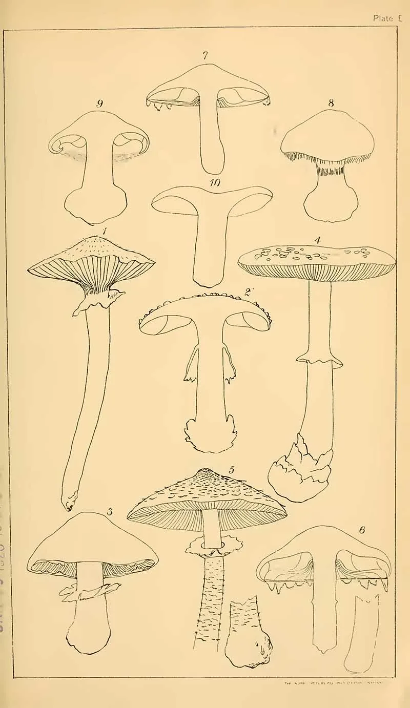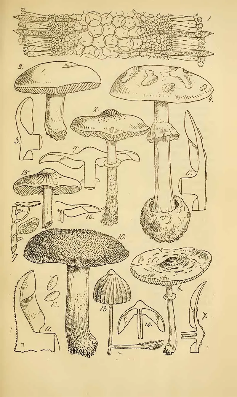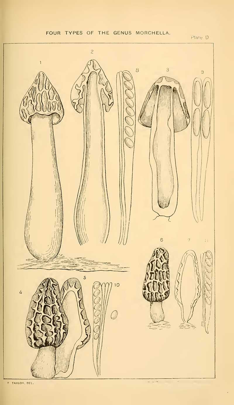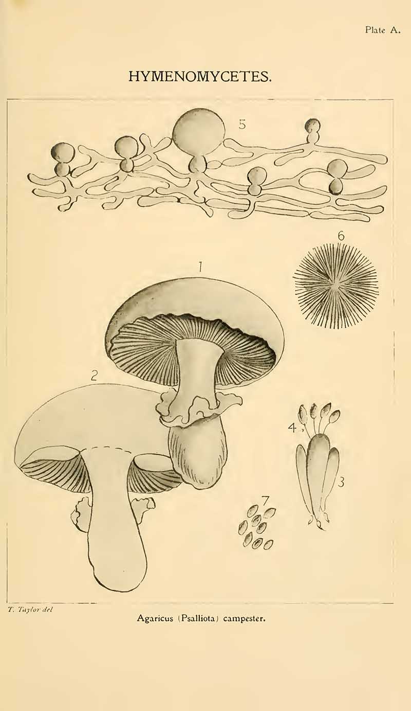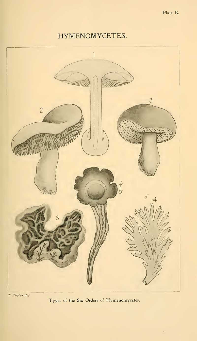 The next set of mushroom drawings is from “Student’s hand-book of mushrooms of America edible and poisonous” 1897, by Taylor, Thomas.