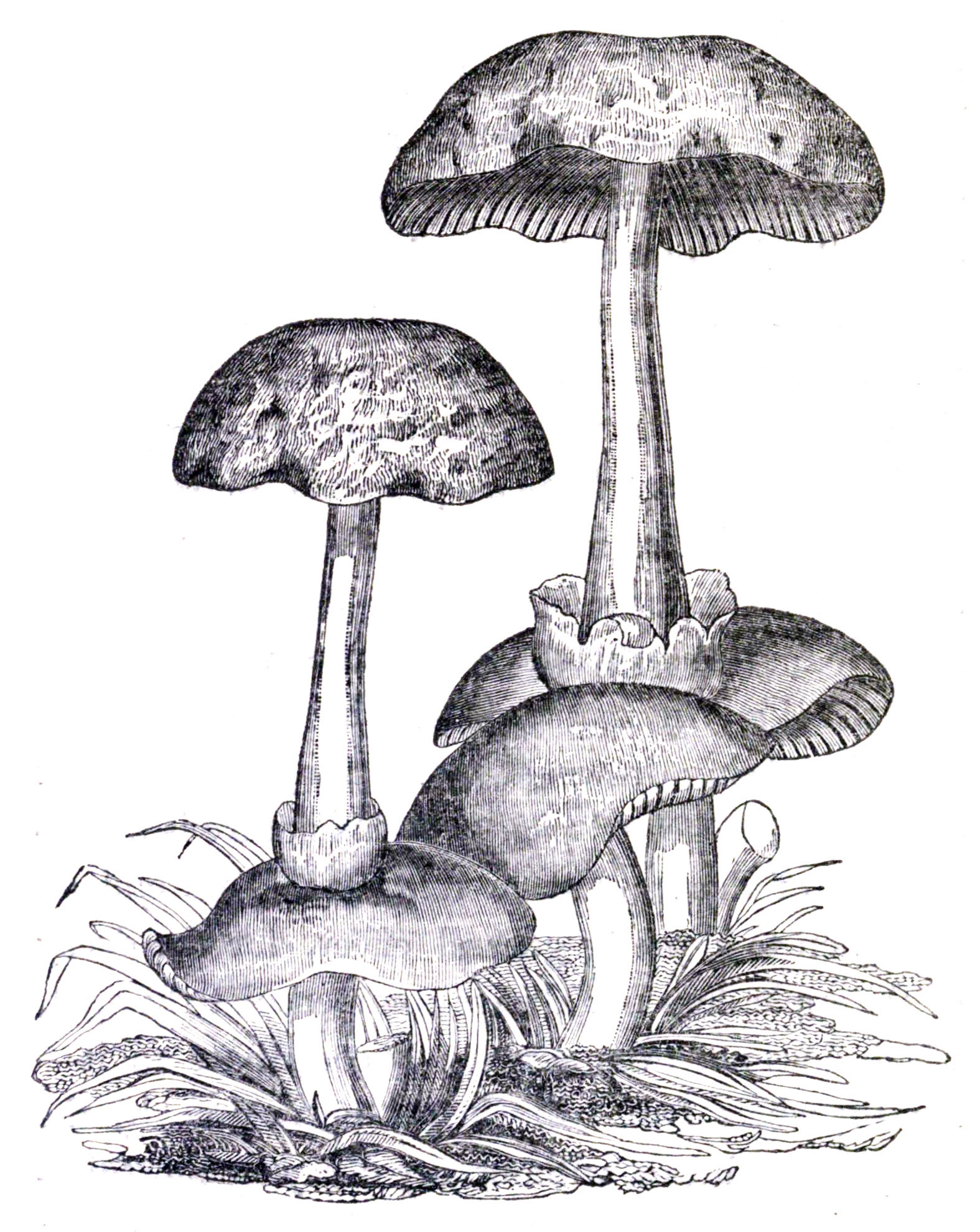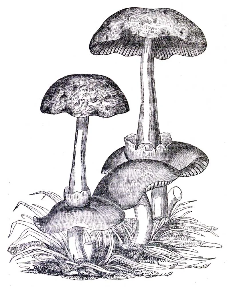 Drawings of various forms and positions of the annulus or ring-characteristics of mushrooms.