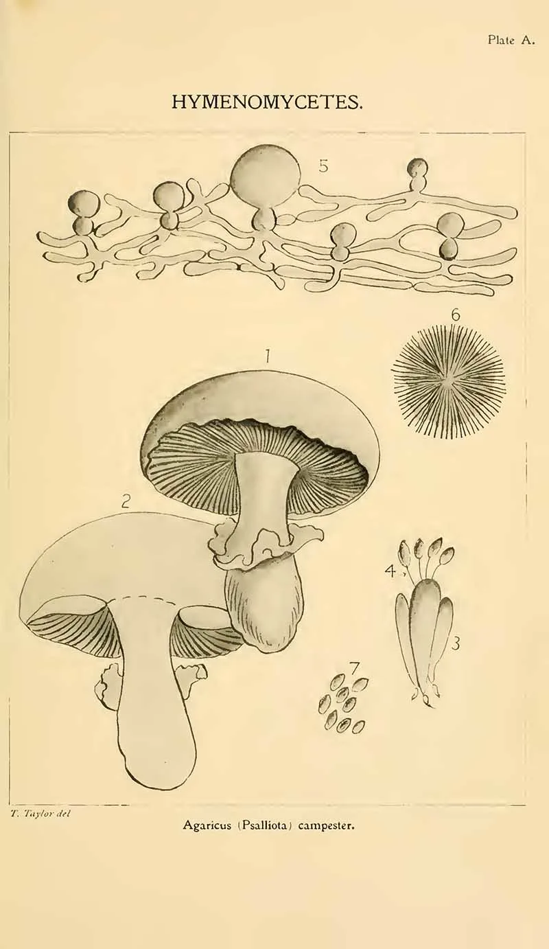 A sketch of the common field mushroom, Agaricus campester.